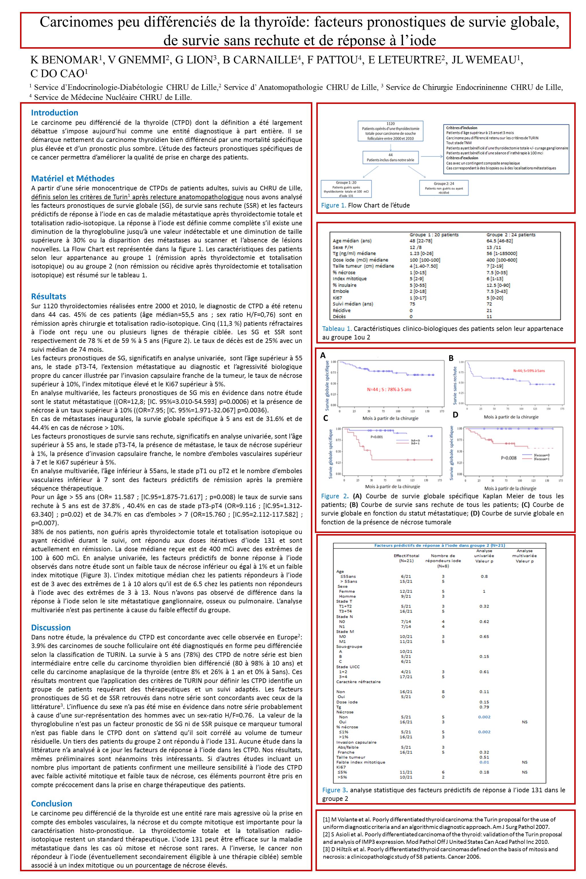 Sur 1120 thyroïdectomies réalisées entre 2000 et 2010, le diagnostic de CTPD a été retenu dans 44 cas. 45% de ces patients (âge médian=55,5 ans ; sex ratio H/F=0,76) sont en rémission après chirurgie et totalisation radio-isotopique. Les SG et SSR sont respectivement de 78 % et de 59 % à 5 ans. Les facteurs de mauvais pronostic de SG en analyse multivariée sont le statut métastatique et le pourcentage de nécrose > 10%. Les facteurs de mauvais pronostic de SSR en analyse multivariée sont l’âge >55 ans, le stade pT3/pT4 et les emboles vasculaires >7. Un tiers des patients métastatiques a été mis secondairement en rémission après traitement radio-isotopique. En analyse univariée, la réponse à l’iode est corrélée à un taux de nécrose <1% et à un index mitotique faible.