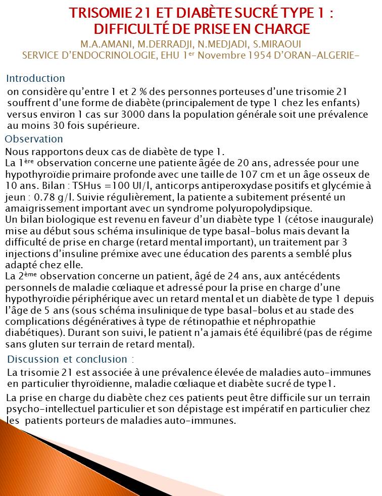 Introduction : on considère qu’entre 1 et 2 % des personnes porteuses d’une trisomie 21 souffrent d’une forme de diabète (principalement de type 1 chez les enfants) versus environ 1 cas sur 3000 dans la population générale soit une prévalence au moins 30 fois supérieure.