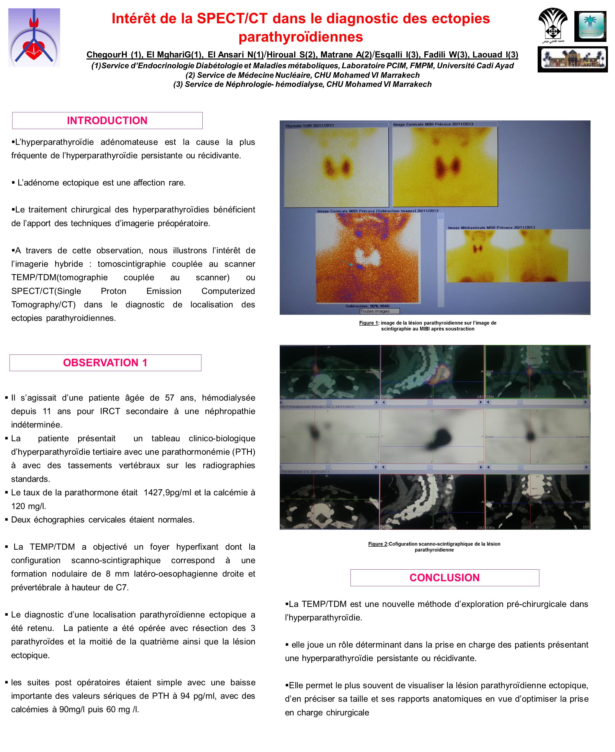 La TEMP/TDM est une nouvelle méthode d’exploration pré-chirurgicale dans l’hyperparathyroïdie, joue un rôle déterminant dans la prise en charge des patients présentant une hyperparathyroïdie persistante ou récidivante. Elle permet le plus souvent de visualiser la lésion parathyroïdienne ectopique.