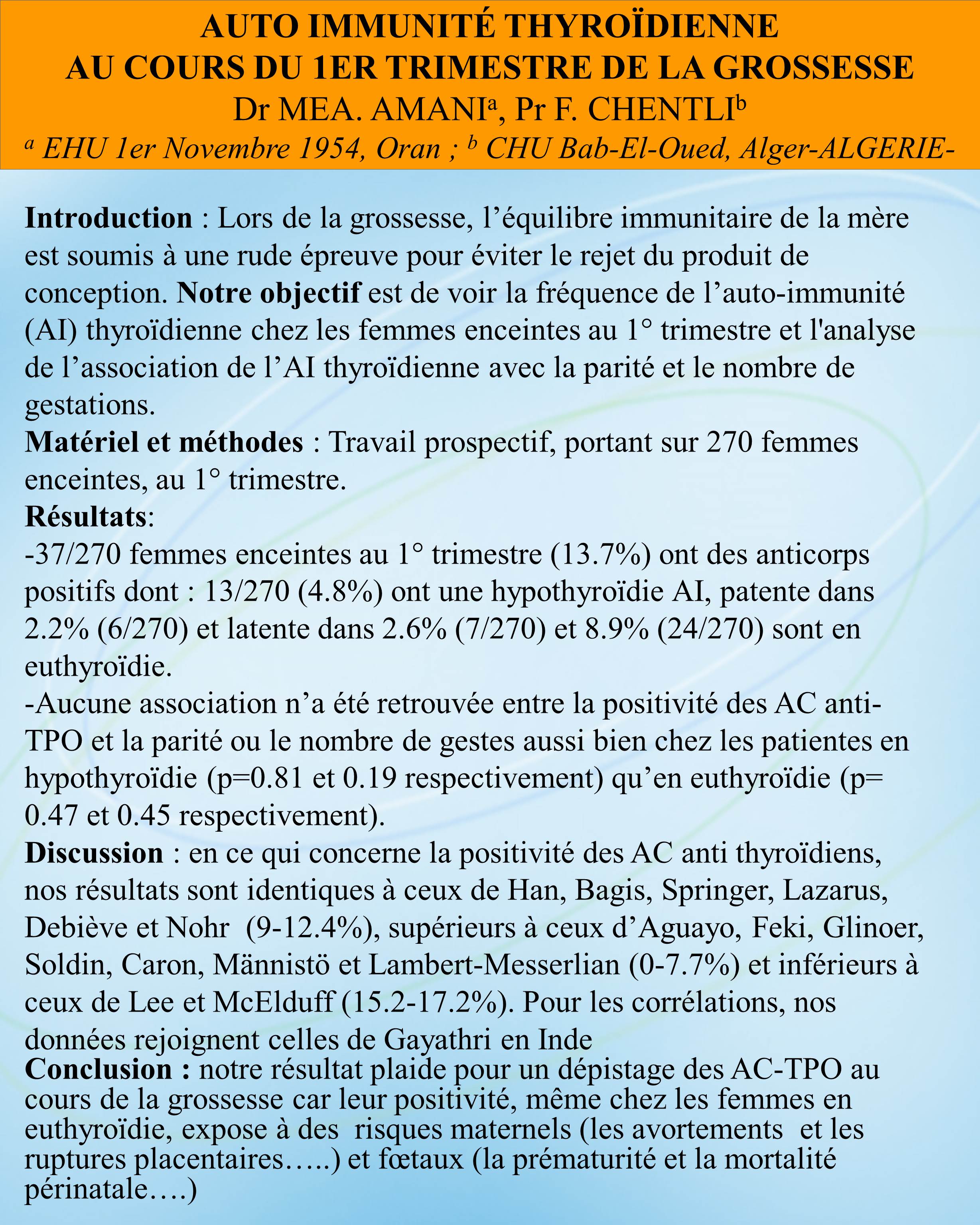 -37/270 femmes enceintes au 1° trimestre (13.7%) ont des anticorps positifs dont : 13/270 (4.8%) ont une hypothyroïdie AI, patente dans 2.2% (6/270) et latente dans 2.6% (7/270) et 8.9% (24/270) sont en euthyroïdie.