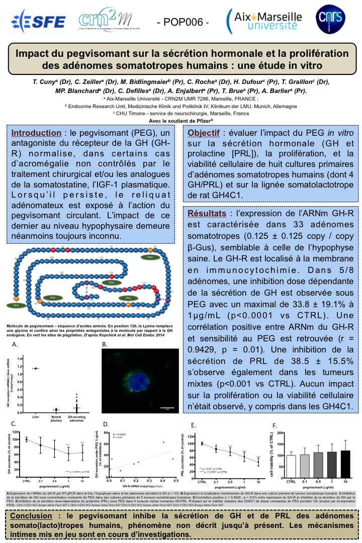 Résultats : l’expression de l’ARNm du GH-R est caractérisée dans 33 adénomes somatotropes (0.125 ± 0.125 copy / copy b-Gus), semblable à celle de l’hypophyse saine. Le GH-R est localisé à la membrane en immunocytochimie. Dans 6/8 adénomes, une inhibition dose dépendante de la sécrétion de GH est observée sous PEG avec un maximal de 33.8 ± 19.1% à 1mg/mL (p < 0.0001 vs CTRL). Une corrélation positive entre ARNm du GH-R et sensibilité au PEG est retrouvée (r = 0.9429, p = 0.01). Une inhibition de la sécrétion de PRL de 38.5 ± 15.5% s’observe également dans les tumeurs mixtes (p <0.001 vs CTRL). Aucun impact sur la prolifération ou la viabilité cellulaire n’était observé, y compris dans les GH4C1.