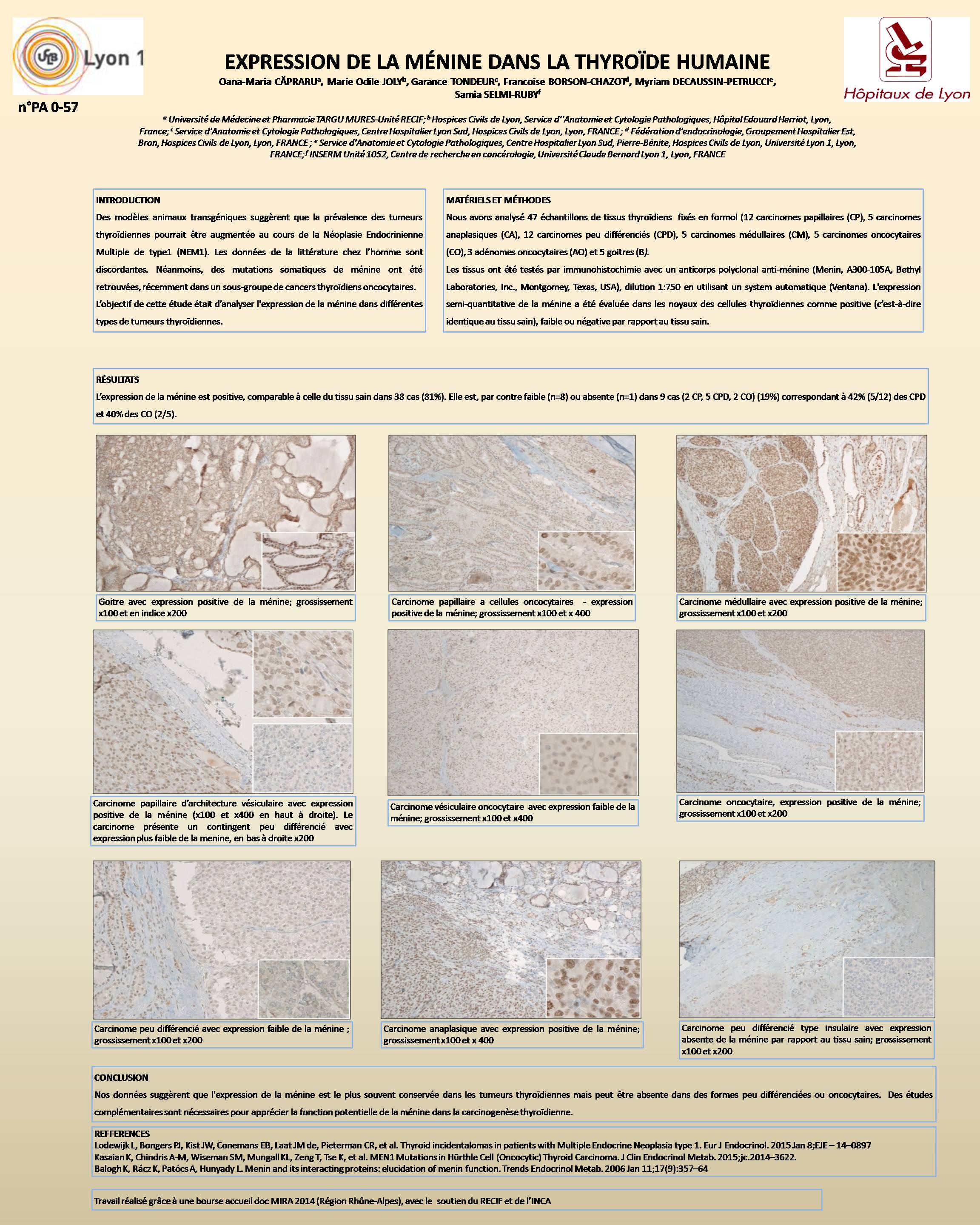 a Université de Médecine et Pharmacie TARGU MURES-Unité RECIF; INSERM Unité 1052, Centre de recherche en cancérologie, Université Claude Bernard Lyon 1, Targu Mures, ROUMANIE ; b Hospices Civils de Lyon, Service d’'Anatomie et Cytologie Pathologiques, Hôpital Edouard Herriot, Lyon, FRANCE ; c Service d'Anatomie et Cytologie Pathologiques, Centre Hospitalier Lyon Sud, Hospices Civils de Lyon, Lyon, FRANCE ; d Fédération d'endocrinologie, Groupement Hospitalier Est, Bron, Hospices Civils de Lyon, Lyon, FRANCE ; e Service d'Anatomie et Cytologie Pathologiques, Centre Hospitalier Lyon Sud, Pierre-Bénite, Hospices Civils de Lyon, Université Lyon 1, Lyon, FRANCE ; f INSERM Unité 1052, Centre de recherche en cancérologie, Université Claude Bernard Lyon 1, Lyon, FRANCE