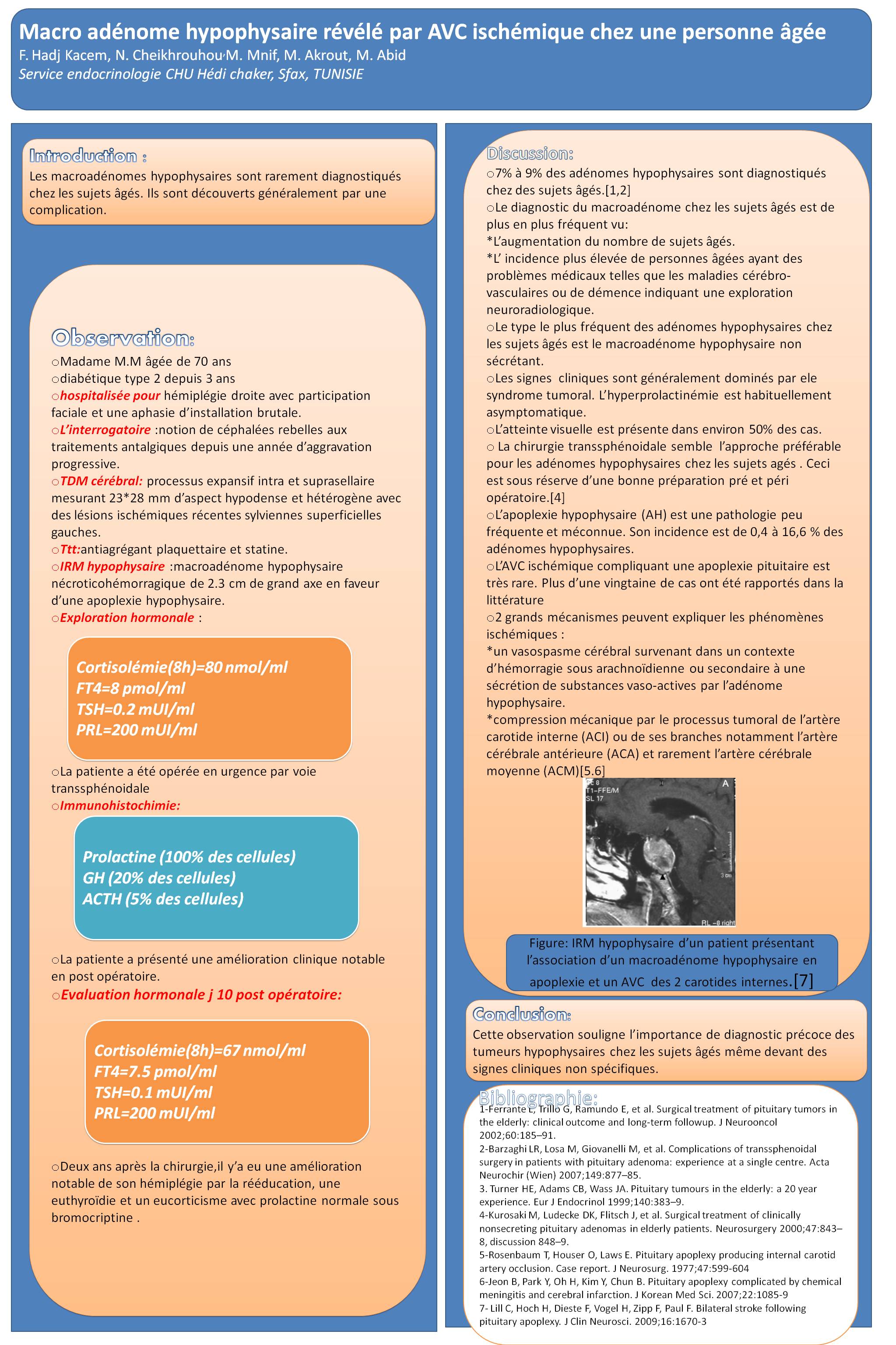 Observation :Madame M.M âgée de 70 ans diabétique type 2 depuis 3 ans a été hospitalisée pour hémiplégie droite avec participation faciale et une aphasie d’installation brutale.L’interrogatoire retrouve la notion de céphalées rebelles aux traitements antalgiques depuis une année d’aggravation progressive.Un scanner cérébral a objectivé un processus expansif intra et suprasellaire mesurant 23*28 mm d’aspect hypodense et hétérogène avec des lésions ischémiques récentes sylviennes superficielles gauches. La patiente a été traitée par antiagrégant plaquettaire et statine.Une IRM hypophysaire a objectivé les mêmes lésions ischémiques avec un macroadénome hypophysaire nécroticohémorragique de 2.3 cm de grand axe en faveur d’une apoplexie hypophysaire. L’exploration hormonale a objectivé une insuffisance corticotrope,thyréotrope et gonadotrope avec hyperprolactinémie à 200 mUI/l. La patiente a été opérée en urgence par voie transsphénoidale . L’immunohistochimie a montré un adénome hypophysaire mixte exprimant la prolactine (100% des cellules), la GH (20%) et l’ACTH (5%). La patiente a présenté une amélioration clinique notable en post opératoire. L’évaluation hormonale à 10 jours après l’opération a montré la persistance de l’ insuffisance corticotrope,thyréotrope et gonadotrope avec hyperprolactinémie . L’IRM hypophysaire a été refusée par la patiente.Deux ans après la chirurgie,il y’a eu une amélioration notable de son hémiplégie par la rééducation, une euthyroïdie et un eucorticisme avec prolactine normale sous traitement.