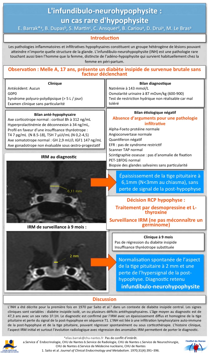Une femme de 17 ans, sans antécédent, a présenté brutalement un syndrome polyuro-polydipsique (>5L/jour) sans facteur déclenchant (absence de grossesse). Le test de restriction hydrique n’a pas été réalisé car jugé dangereux en raison d’une natrémie à 143mmol/L, osmolarité urinaire à 87mosm/kg (600-900). Le diagnostic de diabète insipide (DI) central a été retenu compte-tenu d’anomalie IRM associée (épaississement de la tige pituitaire à 6,1mm [N<3mm au chiasma], sans perte de signal de la post-hypophyse). Le bilan hormonal était normal en dehors d’une insuffisance thyréotrope (T4 à 6,8 pg/ml, TSH insuffisamment augmentée). Le bilan étiologique comprenant scanner TAP, PET-18FDG était négatif. La patiente a été substituée par desmopressine et L-thyroxine. A 9 mois, l’IRM a montré une normalisation spontanée de l’aspect de la tige pituitaire à 2 mm et une perte de l’hypersignal de la post-hypophyse, sans régression clinique du DI ni de l’insuffisance thyréotrope.