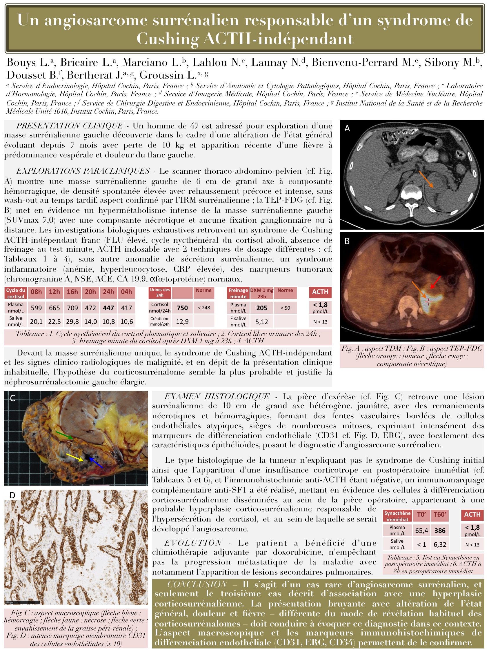 Introduction. L’angiosarcome épithélioïde est une tumeur rare et agressive de la surrénale. Observation. Nous rapportons le cas d’un homme de 47 ans, présentant depuis 6 mois un tableau associant altération de l’état général, amaigrissement, et apparition récente d’une fièvre avec syndrome inflammatoire biologique, et lombalgies gauches. Un scanner retrouve alors une masse surrénalienne gauche de 6 cm, hétérogène, avec une composante nécrotique, de densité spontanée élevée, avec wash-out insuffisant, et fixant intensément le 18-FDG en TEP TDM, sans localisation secondaire identifiable. Les explorations hormonales révèlent un syndrome de Cushing ACTH indépendant franc (FLU élevé, cycle nycthéméral du cortisol aboli, freinage minute du cortisol insuffisant, ACTH effondrée). Au total, devant cette masse surrénalienne unique avec caractéristiques clinico-morphologiques de malignité et l’hypercortisolisme, en dépit de l’altération de l'état général, nous nous sommes orientés vers un corticosurrénalome. Le patient a par conséquent subi une néphro-surrénalectomie gauche, retrouvant en histologie une lésion de 10 cm de couleur jaunâtre présentant des remaniements nécrotiques et hémorragiques, réalisant des fentes vasculaires, exprimant des marqueurs de différenciation endothéliale (CD31, ERG) avec focalement des caractéristiques épithélioïdes, posant le diagnostic d’angiosarcome épithélioïde surrénalien. Le syndrome de Cushing initial et l’apparition en postopératoire d’une insuffisance corticotrope nous a conduits à rechercher des cellules corticosurrénaliennes par un immunomarquage anti-SF1, qui étaient présentes de manière diffuse, et intriquées avec les cellules de l'angiosarcome. Discussion. Il s’agit du troisième cas d’adénome corticosurrénalien associé à un angiosarcome épithélioïde surrénalien, avec un mode de présentation piégeant laissant évoquer un corticosurrénalome.