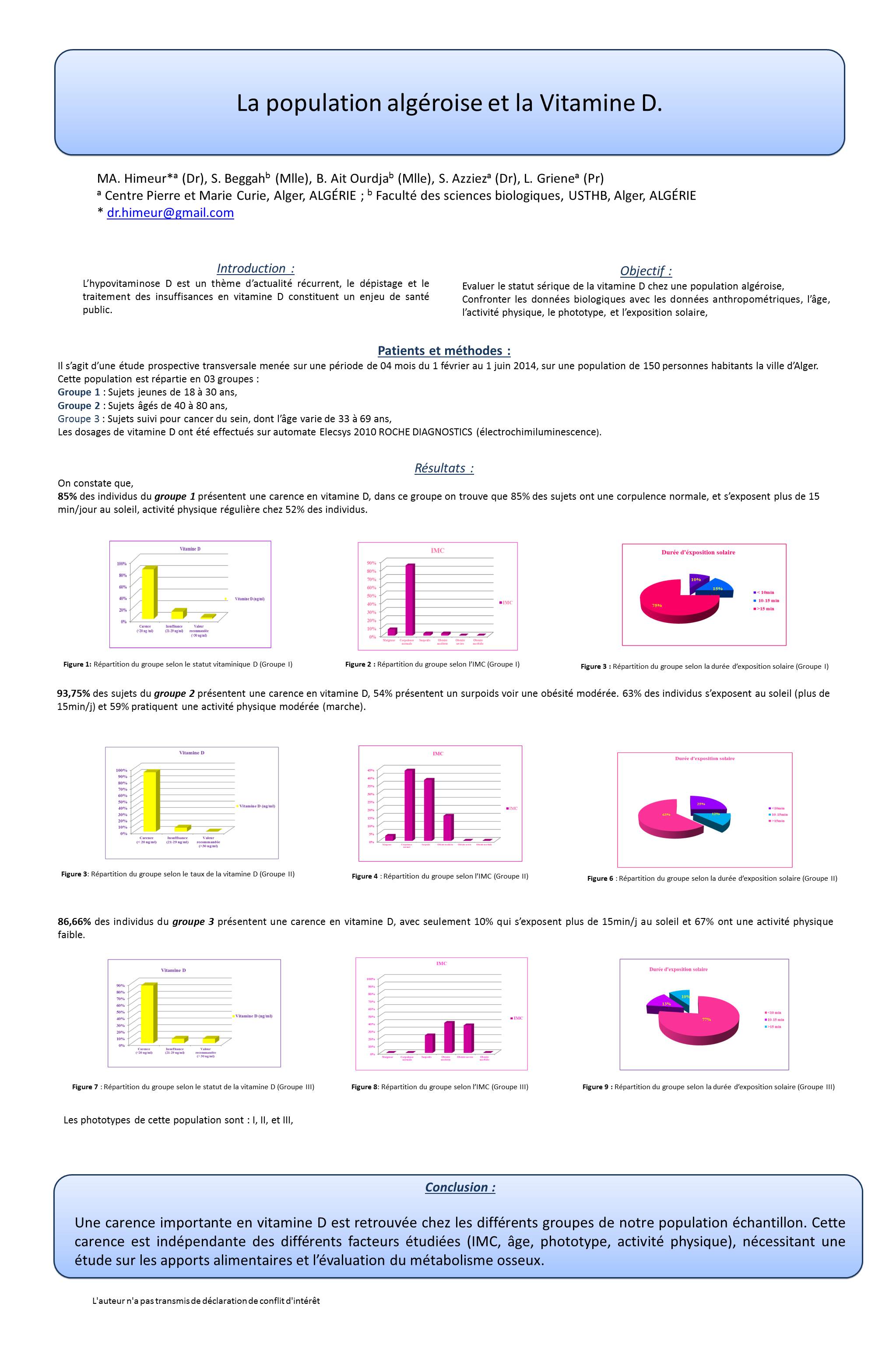 85% des individus du groupe 1 présentent une carence en vitamine D, dans ce groupe on trouve que 85% des sujets ont une corpulence normale, et s’exposent au soleil, activité physique régulière chez 52% des individus.
