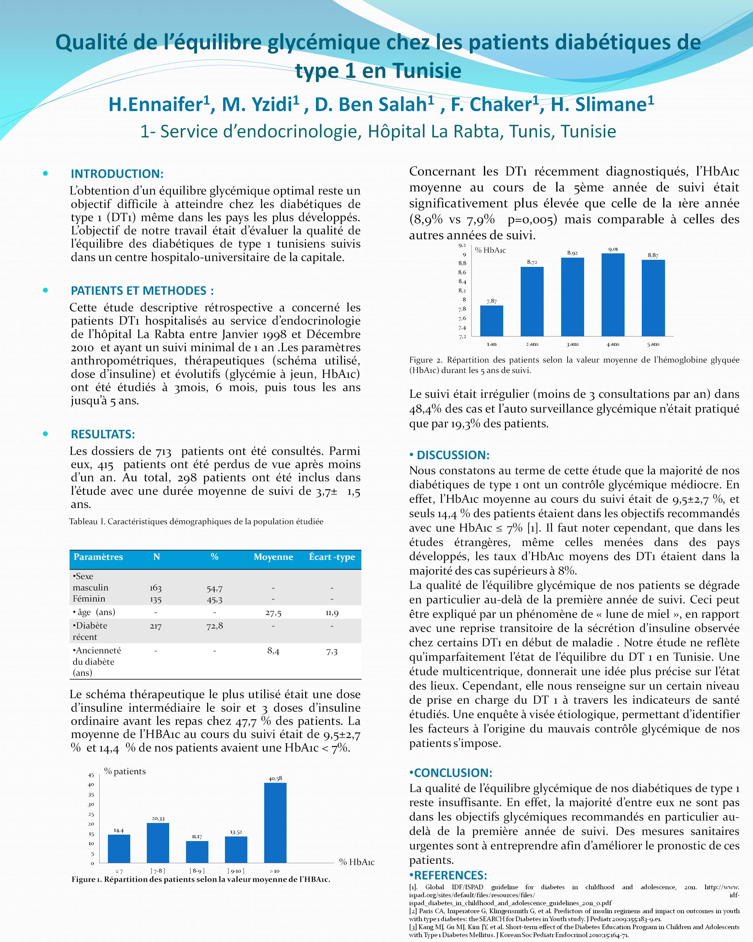 La qualité de l’équilibre glycémique de nos diabétiques de type 1 reste insuffisante. La majorité d’entre eux ne sont pas dans les objectifs glycémiques recommandés en particulier au-delà de la première année de suivi. Une évaluation régulière de nos interventions thérapeutiques permettrait de déterminer les facteurs corrélés à un bon contrôle glycémique.