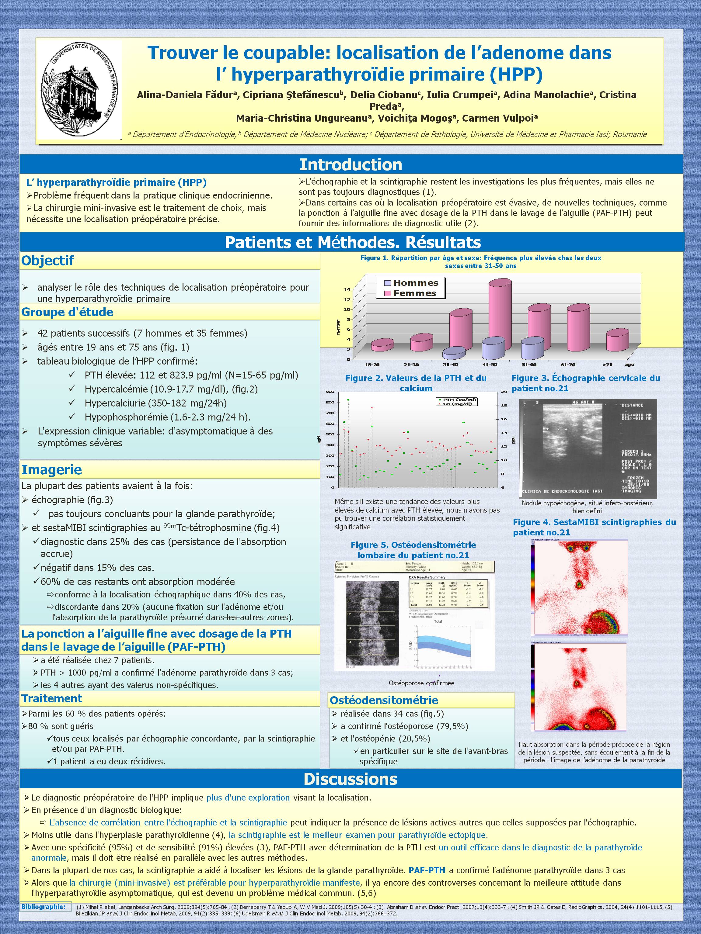 Patients et Méthodes: 42 patients successifs avec tableau biologique de HPP (PTH élevée, hypercalcémie, hypercalciurie, hypophosphorémie) ont été analysés. Tous les patients avaient subi des échographies et des sestaMIBI scintigraphies, avec certitude diagnostique dans 25% des cas, négatif dans 15%. Les 60% restants ont montré une absorption modérée, concordante avec l'échographie dans 40 % des cas, discordante dans 20 % (pas d'absorption et/ou absorption présumée dans d'autres zones). La ponction a l’aiguille fine avec dosage de la PTH dans le lavage de l’aiguille (PAF-PTH) a été réalisée chez 7 patients. PTH > 1000 pg/ml a confirmé l’adénome parathyroïde dans 3 cas, les 4 autres ayant des valerus non-spécifiques. Parmi les 60 % des patients opérés, 80 % sont guéris-tous ceux localisés par échographie concordante, par la scintigraphie et/ou par PAF-PTH.
