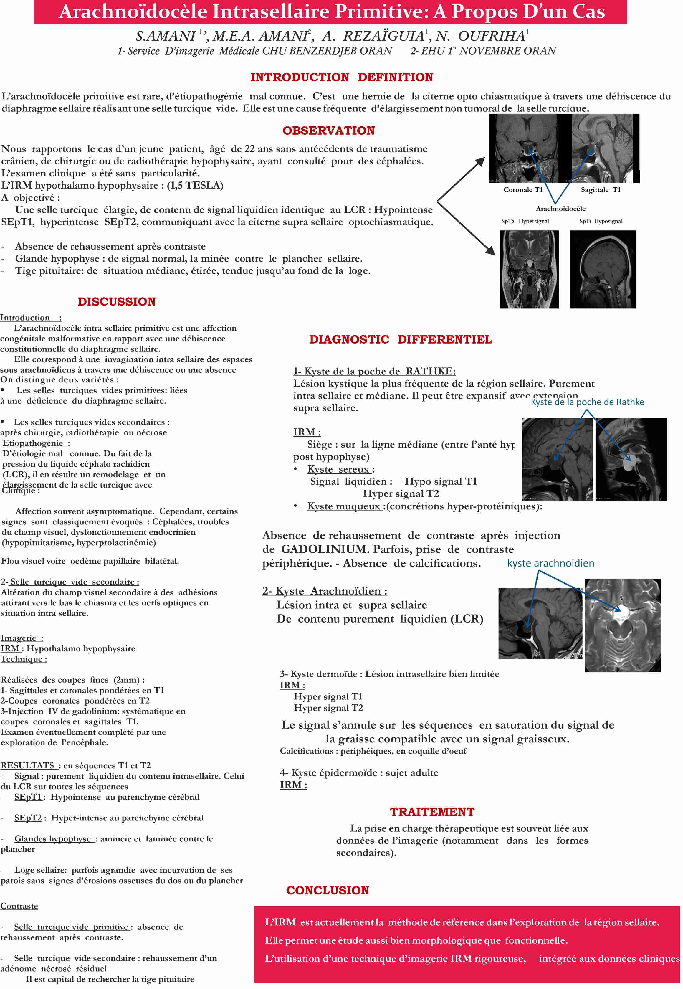 Discussion : l’arachnoidocèle est une cause fréquente d’élargissement non tumoral de la selle turcique. Elle peut etre primitive ou secondaire. Généralement asymptomatique. L’IRM hypothalamohypophysaire constitue la clé du diagnostic.