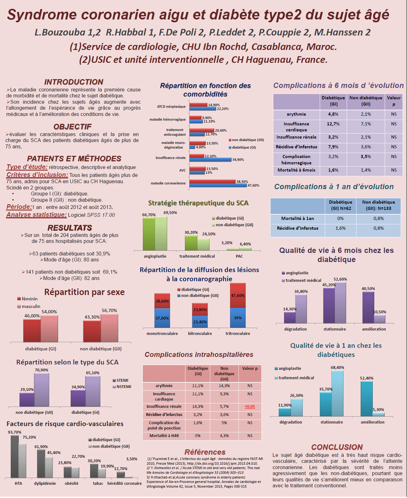 Mode d’âge(GI):80ans;82ans(GII). Discrète prédominance masculine est notée chez les2groupes. Les diabétiques présentent plus de facteurs de risque: fréquence plus élevée d’HTA(p=0,002), dyslipidémie(p=0,034), alors que(GI) est plus plutôt tabagique. Plus de comorbidités chez (GI), notamment insuffisance rénale(p<0,001). SCA sans sus-décalage du segmentST est prédominante dans les2groupes. À la coronarographie, l’atteinte tritronculaire était plus fréquente chez(GI).L’angioplastie est moins utilisée dans le(GI62,7% que le(GII)69,5%. Les complications hospitalières étaient plus élevées chez les diabétiques notamment, l’insuffisance rénale(p=0,055). L’évolution à6et à 12mois révèle une légère prédominance des complications chez(GI). La qualité de vie des diabétiques après une angioplastie était meilleure en comparaison au traitement conventionnel. D’autre part, la qualité de vie des non diabétiques s’améliore mieux que chez les diabétiques,