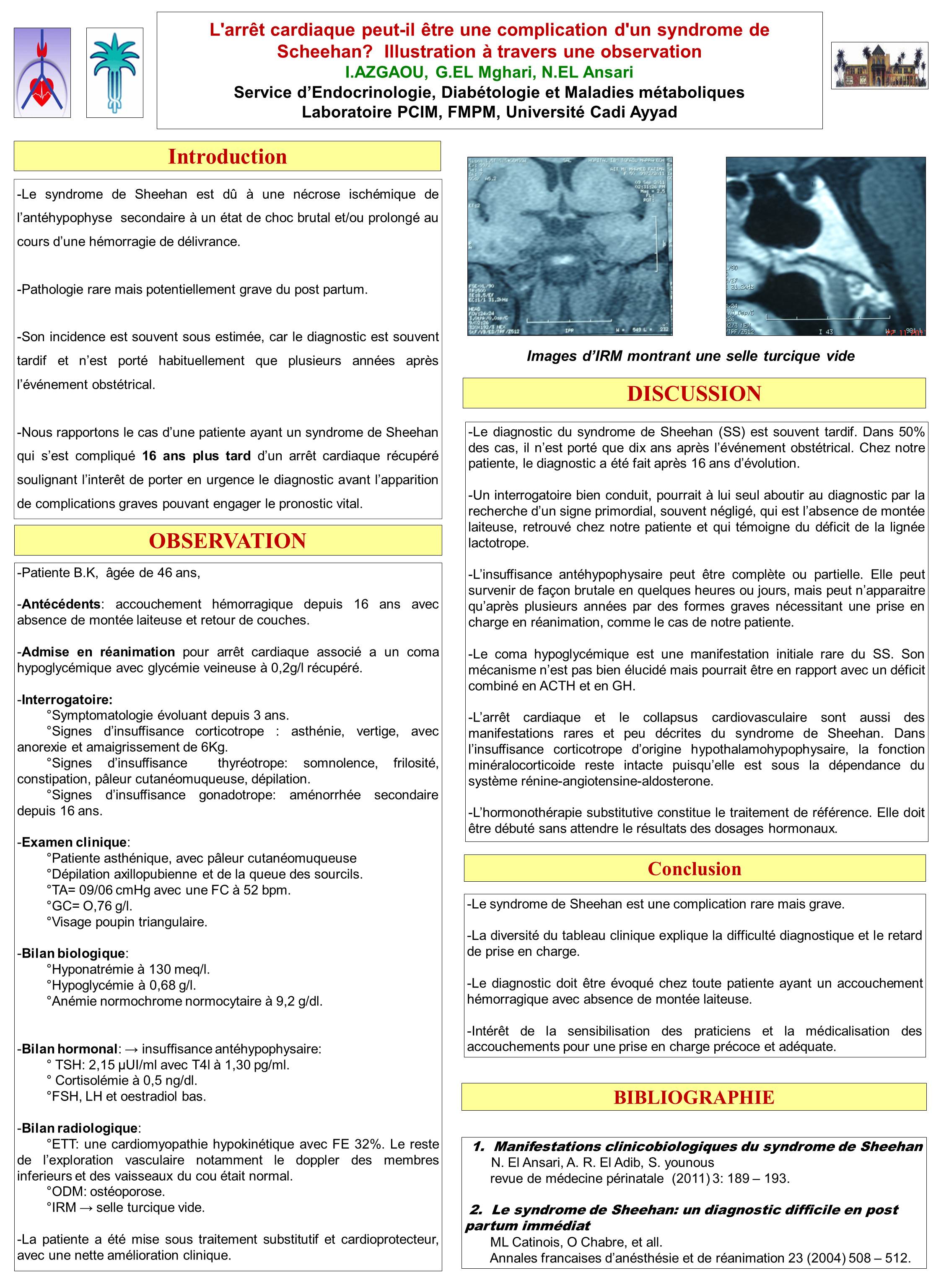 Le syndrome de Scheehan est une complication grave du post partum, dû à une nécrose ischémique de l’antéhypophyse Le diagnostic est souvent difficile et n’est habituellement porté que plusieurs années après l’événement obstétrical. Nous rapportons le cas d’une patiente ayant un syndrome de scheehan qui s’est compliqué 16 ans plus tard d’un arrêt cardiaque récupéré.