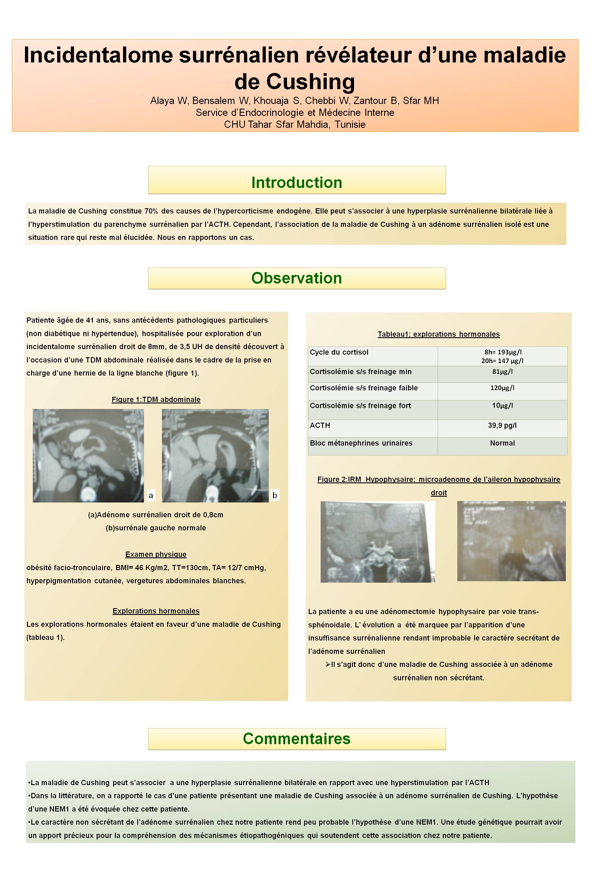 Patiente âgée de 41ans, a été hospitalisée pour exploration d’un incidentalome surrénalien droit de 8 mm, bien limité, de 3 ,5UH, découvert à l’occasion d’une TDM abdominale réalisée dans le cadre de la prise en charge d’une hernie de la ligne blanche. La patiente avait une obésité facio-tronculaire morbide qui a résisté à plusieurs cures d’amincissement (BMI à 46kg/m2, un tour de taille à 130cm) et une hyperpigmentation cutanée. Sa cortisolémie n’était pas freinable sous freinage minute (81ng/ml), ni faible (120ng/ml) mais était à 10ng/ml après freinage fort. L’ACTH était élevée à 39,9pg/ml. Le diagnostic d’une maladie de Cushing a été retenu et l’IRM hypophysaire a montré un microadénome de l’aileron hypophysaire droit. La relecture du scanner abdominal a confirmé le caractère isolé du microadénome surrénalien avec un aspect normal du reste des surrénales. Le dosage des métanéphrines urinaires était normal. La patiente a eu une adénomectomie hypophysaire par voie trans-sphénoïdale. L’évolution a été marquée par l’apparition d’une insuffisance surrénalienne rendant improbable le caractère sécrétant de l’adénome surrénalien.
