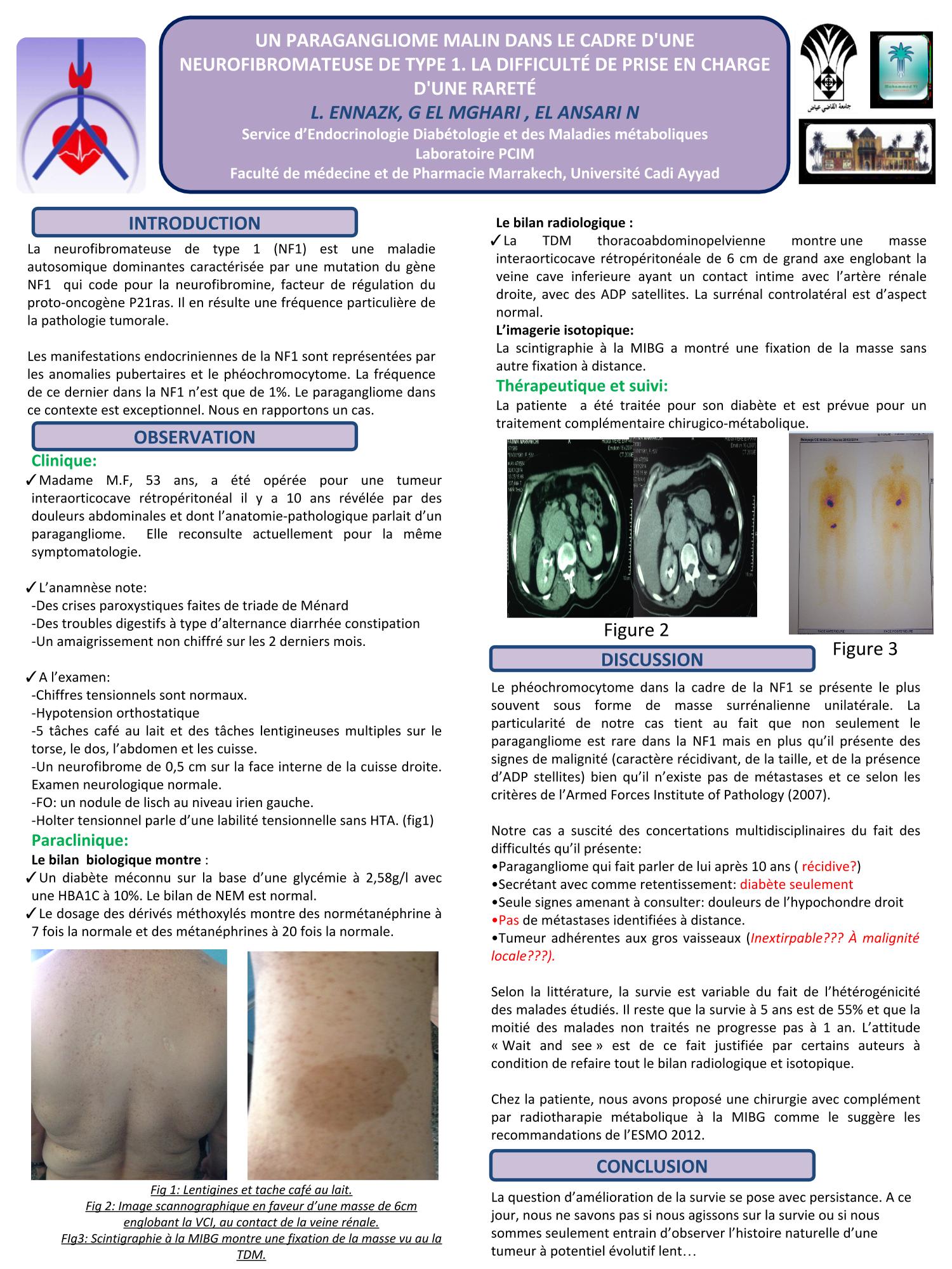 Mme M.F agée de 53 ans, est opérée il y a 10 ans pour un paragangliome rétropéritonéal. L’anamnèse note des crises paroxystiques faites de triade de Ménard, une alternance diarrhée constipation et un amaigrissement non chiffré sur les 2 derniers mois. L’examen note une hypotension orthostatique, 6 tâches café au lait, des tâches lentigineuses. Un neurofibrome de 0,5 cm sur la face interne de la cuisse droite. Au fond de l’œil un nodule de lisch irien gauche. Le holter tensionnel est normal. Le bilan phosphocalcique est normal. Au bilan, les normétanéphrine à 7 fois la normale et des métanéphrines à 20 fois la normale. Le dosage de la calcitonine est normal. Le bilan d’imagerie montre : Au scanner thoracoabdominopelvien une masse interaorticocave rétropéritonéale de 6 cm englobant la veine cave inferieure ayant un contact intime avec l’artère rénale droite, avec des ADP satellites. A la scintigraphie à la MIBG a montré une fixation de la masse sans autre fixation à distance. Actuellement la patiente est prévue pour radiothérapie métabolique.