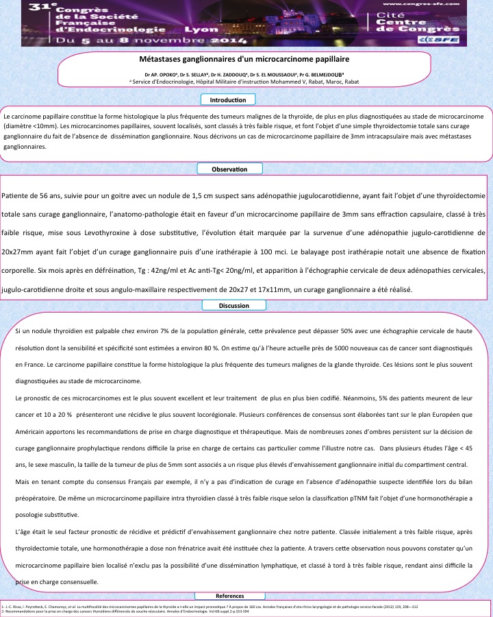 Le carcinome papillaire constitue la forme histologique la plus fréquente des tumeurs malignes de la thyroïde, de plus en plus diagnostiquées au stade de microcarcinome (diamètre <10mm). Les microcarcinomes papillaires, souvent localisés, sont classés à très faible risque, et font l’objet d’une simple thyroïdectomie totale sans curage ganglionnaire du fait de l’absence de dissémination ganglionnaire. Nous décrivons un cas de microcarcinome papillaire de 3mm intracapsulaire mais avec métastases ganglionnaires.