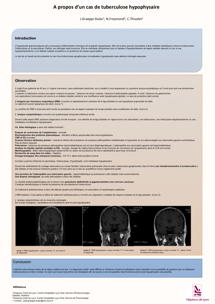 Une biopsie chirurgicale d’une adénopathie sus claviculaire découverte au scanner et hypermétabolique au PETscanner a donc été réalisée. Les analyses histologiques et bactériologiques ont permis de poser le diagnostic de tuberculose hypophysaire.