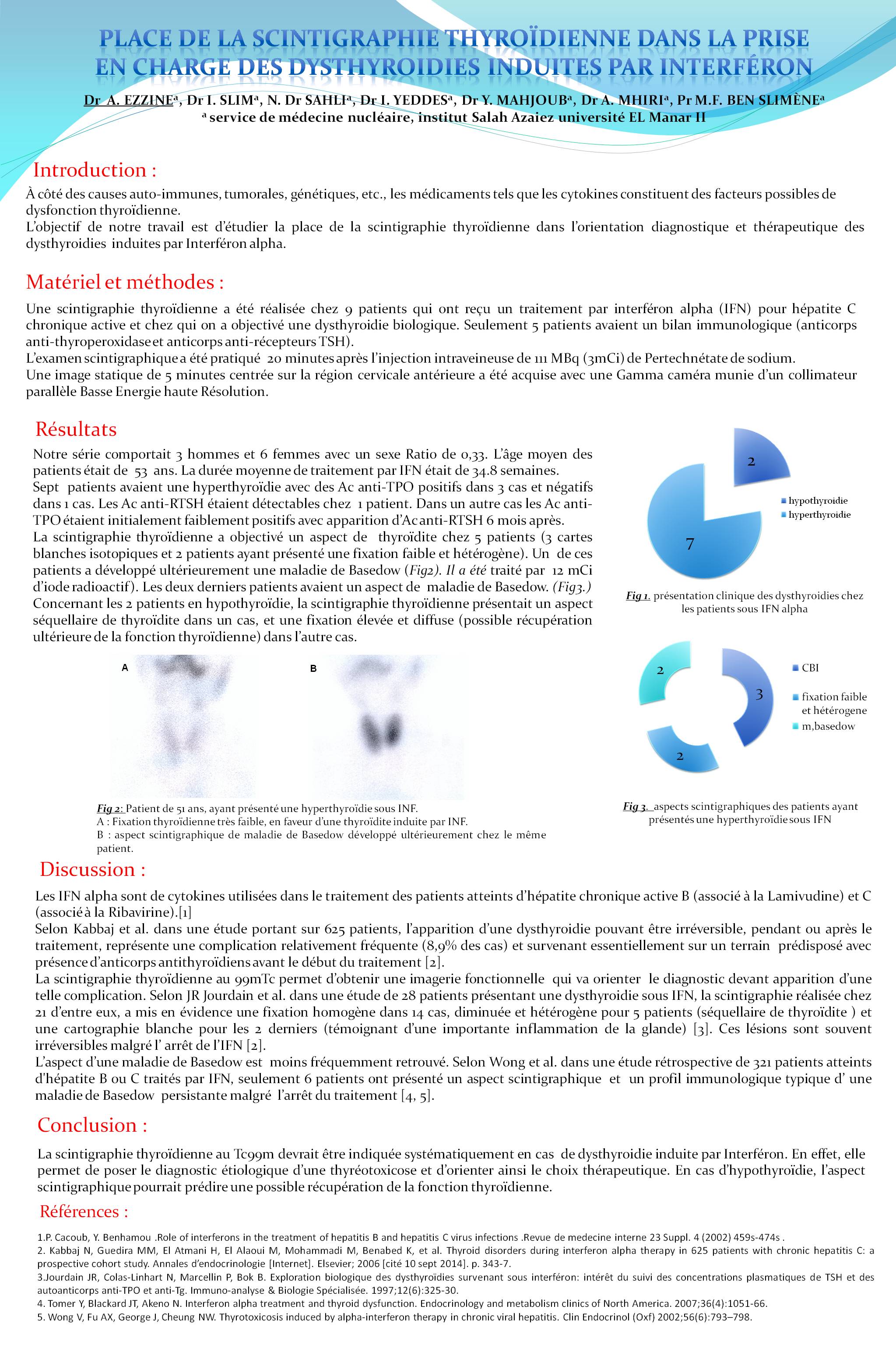 L’âge moyen des patients était de 53 ans (sexe Ratio de 0,33). La durée moyenne de traitement par interféron était de 34.85 semaines. Sept patients avaient une hyperthyroïdie avec des Ac anti-TPO positifs dans 3 cas et négatifs dans 1 cas. Les Ac anti-RTSH étaient détectables chez 1 patient. Dans un autre cas les Ac anti-TPO étaient initialement faiblement positif avec apparition d’Ac anti-RTSH 6 mois après. La scintigraphie thyroïdienne avait objectivé un aspect de thyroïdite chez 5 patients, avec transformation en maladie de Basedow (traité par de l’iode radioactif). Les deux derniers patients avaient un aspect de maladie de Basedow.