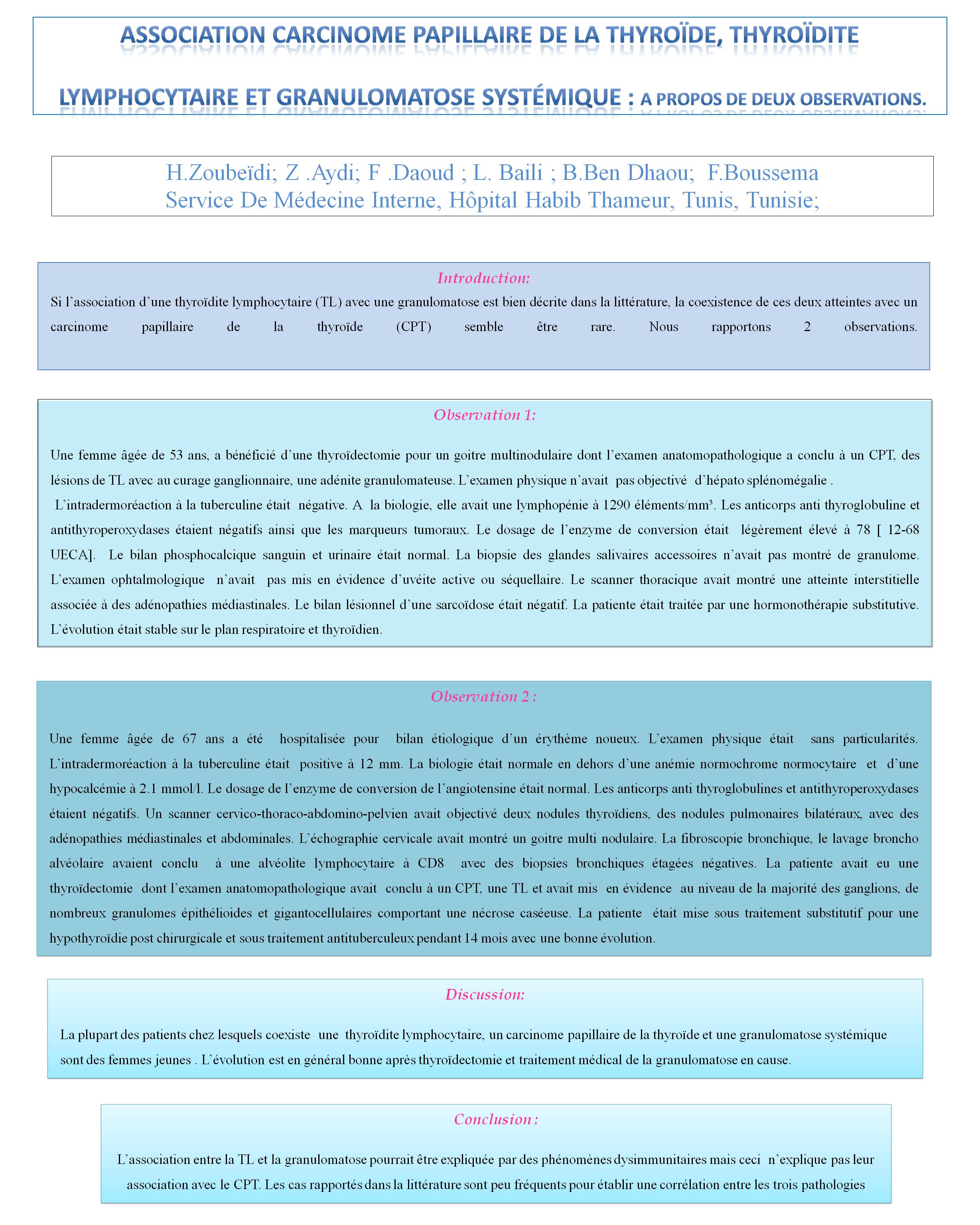 Si l’association d’une thyroïdite lymphocytaire (TL) avec une granulomatose est bien décrite dans la littérature, la coexistence de ces deux atteintes avec un carcinome papillaire de la thyroïde (CPT) semble être rare.