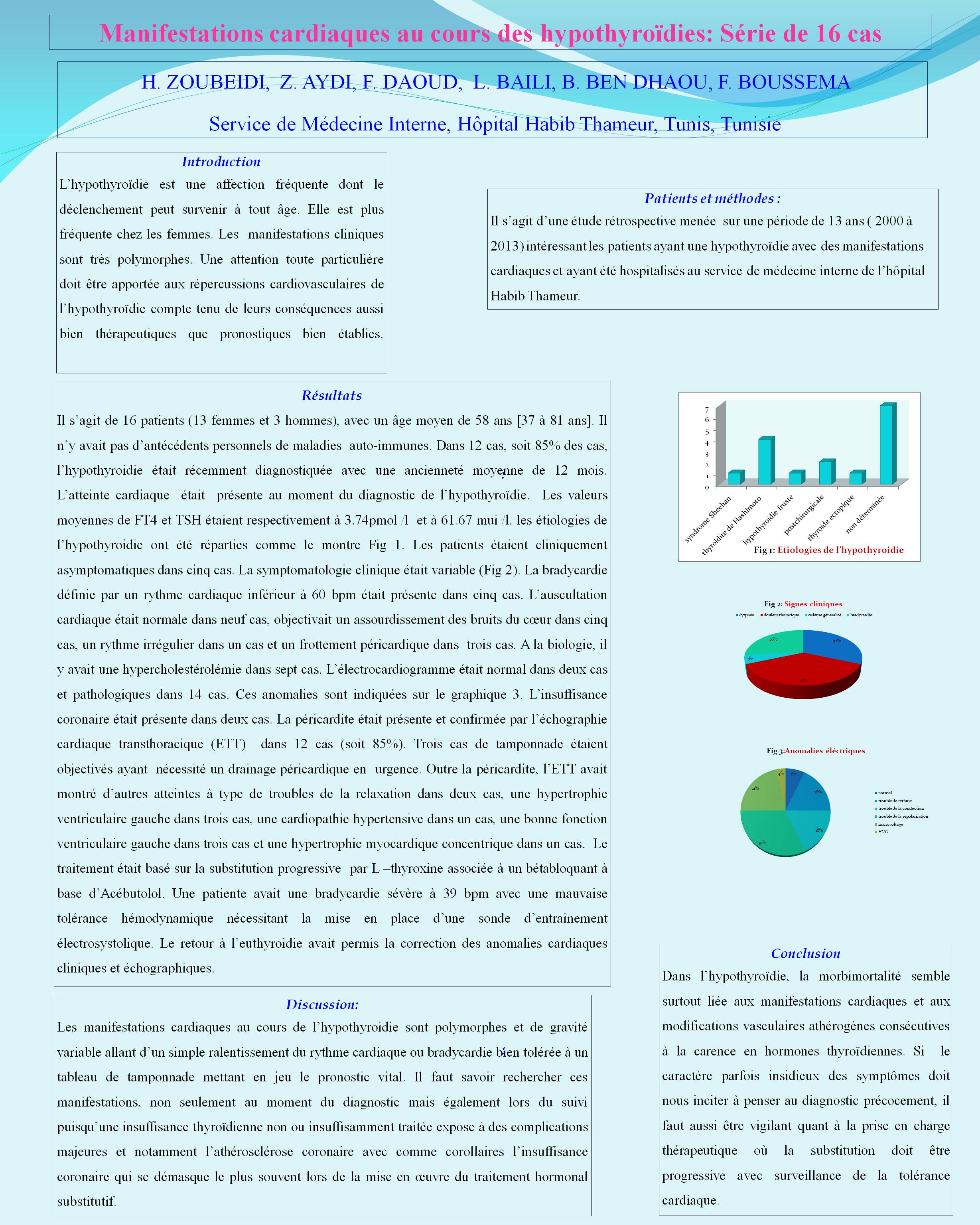 Il s’agit d’une étude rétrospective intéressant les patients ayant une hypothyroïdie avec des manifestations cardiaques et ayant été hospitalisés au service de médecine interne de l’hôpital Habib Thameur.