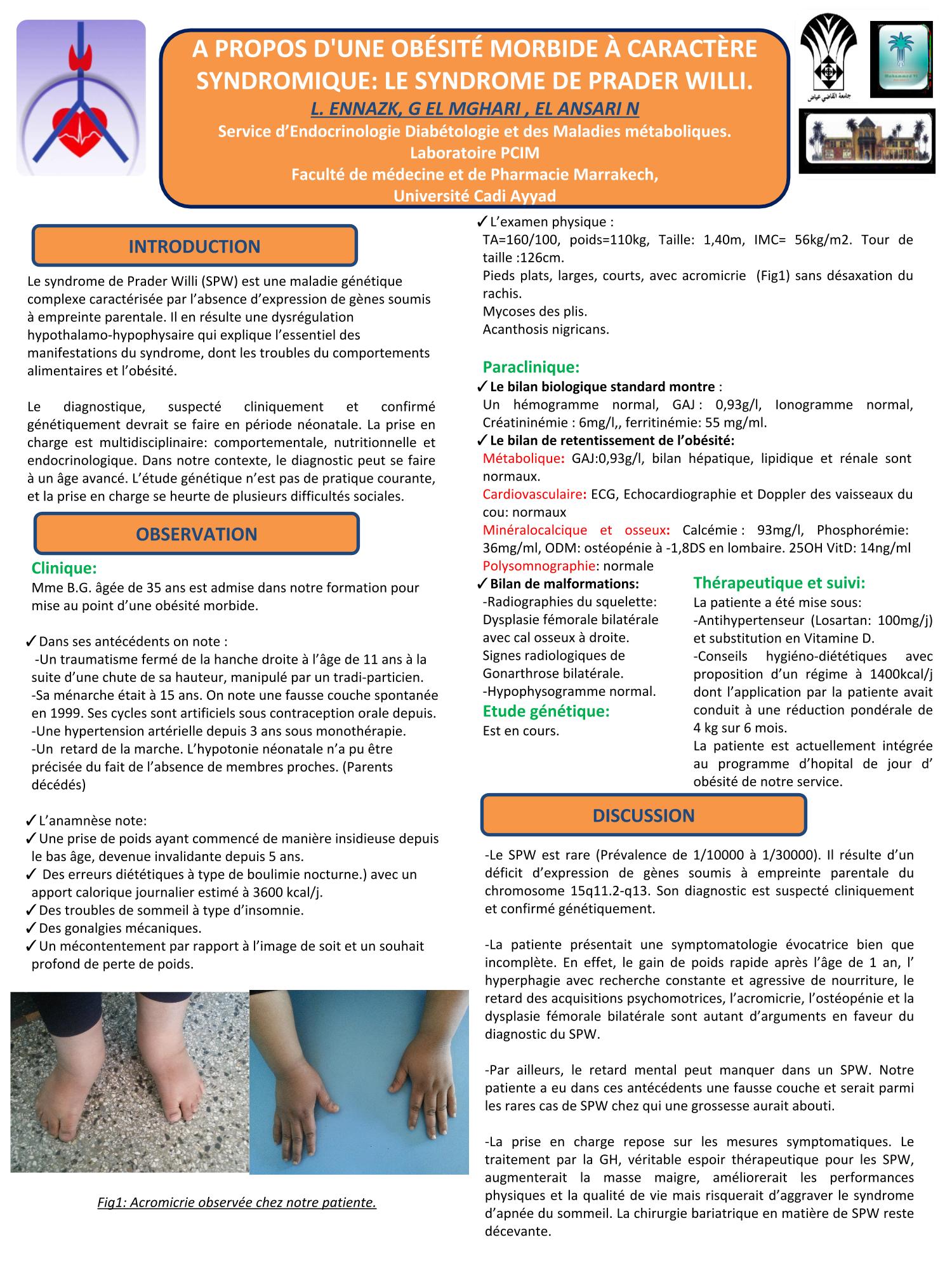 Le syndrome de Prader-Willi (SPW) est une maladie génétique rare, caractérisée par un dysfonctionnement hypothalamohypophysaire et un déséquilibre de la balance énergétique. Nous rapportons un cas de suspicion clinique de syndrome de Prader Willi au cours d’un bilan d’une obésité morbide.