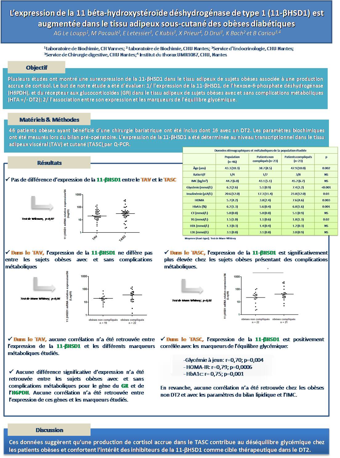 46 patients obèses ayant bénéficié d’une chirurgie bariatrique ont été inclus dont 16 avec un DT2. Les paramètres associés à l’équilibre glycémique ont été mesurés lors du bilan pré-opératoire. L’expression de la 11-βHSD1 a été déterminée au niveau transcriptionnel dans le tissu adipeux viscéral (TAV) et cutané (TASC)par Q-PCR.