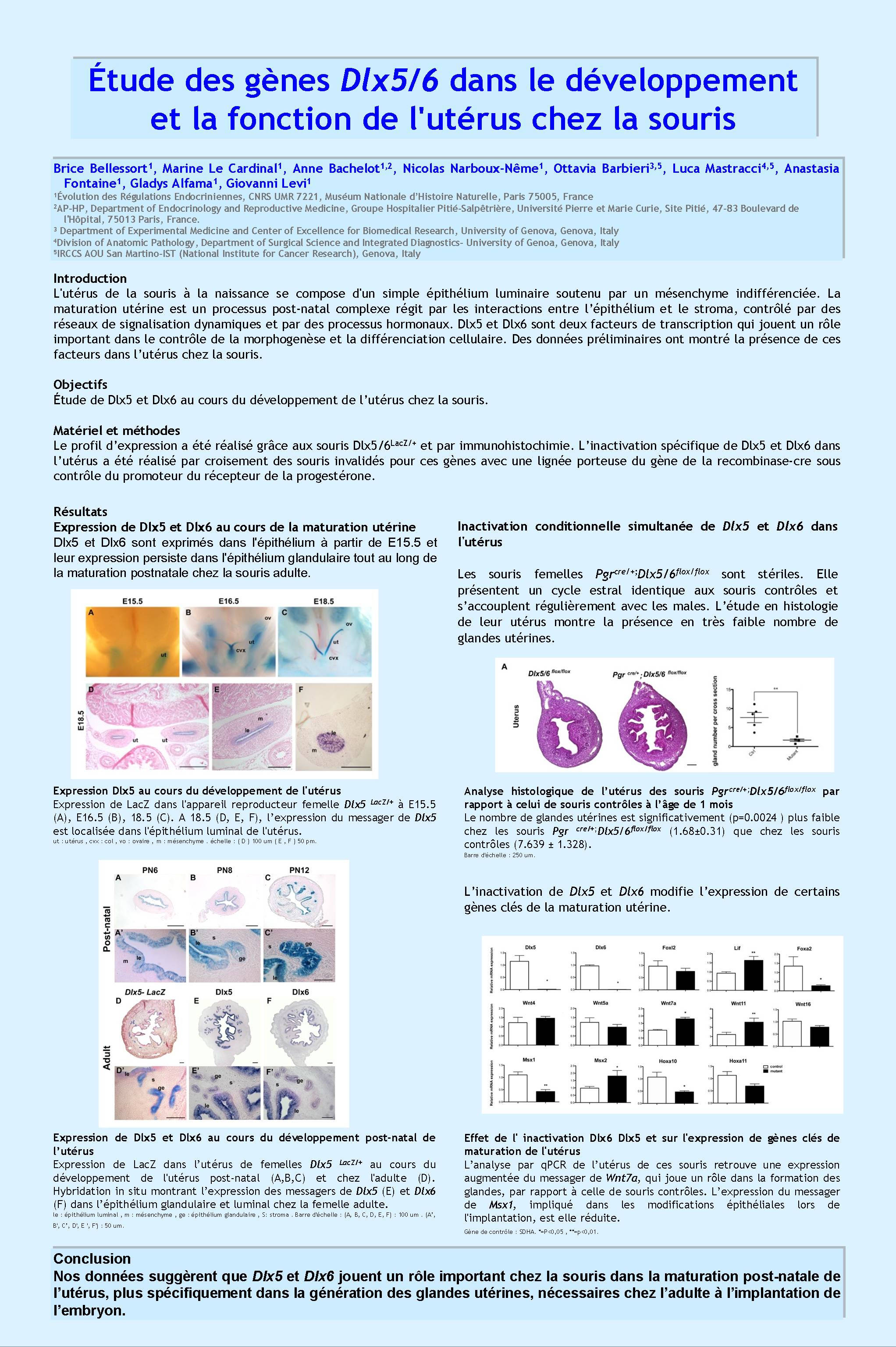 Matériel et méthodes Le profil d’expression a été réalisé grâce aux souris Dlx5/6LacZ/+ et par immunohistochimie. L’inactivation spécifique de Dlx5 et Dlx6 dans l’utérus a été réalisé par croisement des souris invalidés pour ces gènes avec une lignée porteuse du gène de la recombinase-cre sous contrôle du promoteur du récepteur de la progestérone.