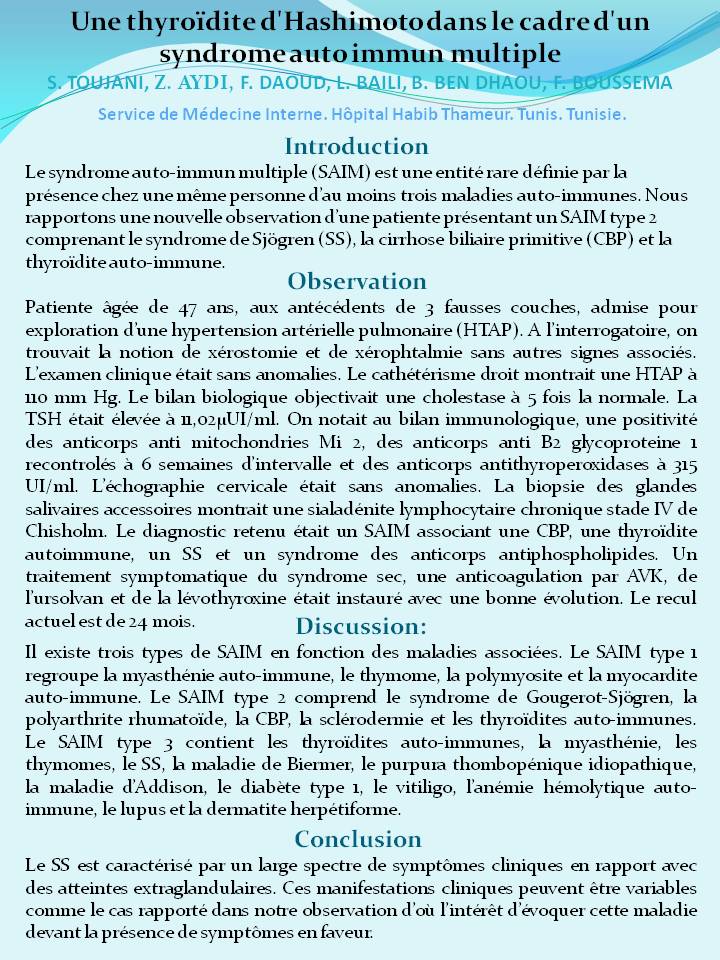 Patiente âgée de 47 ans, aux antécédents de 3 fausses couches, admise pour exploration d’une hypertension artérielle pulmonaire (HTAP). A l’interrogatoire, on trouvait la notion de xérostomie et de xérophtalmie sans autres signes associés. L’examen clinique était sans anomalies. Le cathétérisme droit montrait une HTAP à 110 mm Hg. Le bilan biologique objectivait une cholestase à 5 fois la normale. La TSH était élevée à 11,02μUI/ml. On notait au bilan immunologique, une positivité des anticorps anti mitochondries Mi 2, des anticorps anti B2 glycoproteine 1 recontrolés à 6 semaines d’intervalle et des anticorps antithyroperoxidases à 315 UI/ml. L’échographie cervicale était sans anomalies. La biopsie des glandes salivaires accessoires montrait une sialadénite lymphocytaire chronique stade IV de Chisholm. Le diagnostic retenu était un SAIM associant une CBP, une thyroïdite autoimmune, un SS et un syndrome des anticorps antiphospholipides. Un traitement symptomatique du syndrome sec, une anticoagulation par AVK, de l’ursolvan et de la lévothyroxine était instauré avec une bonne évolution. Le recul actuel est de 24 mois.