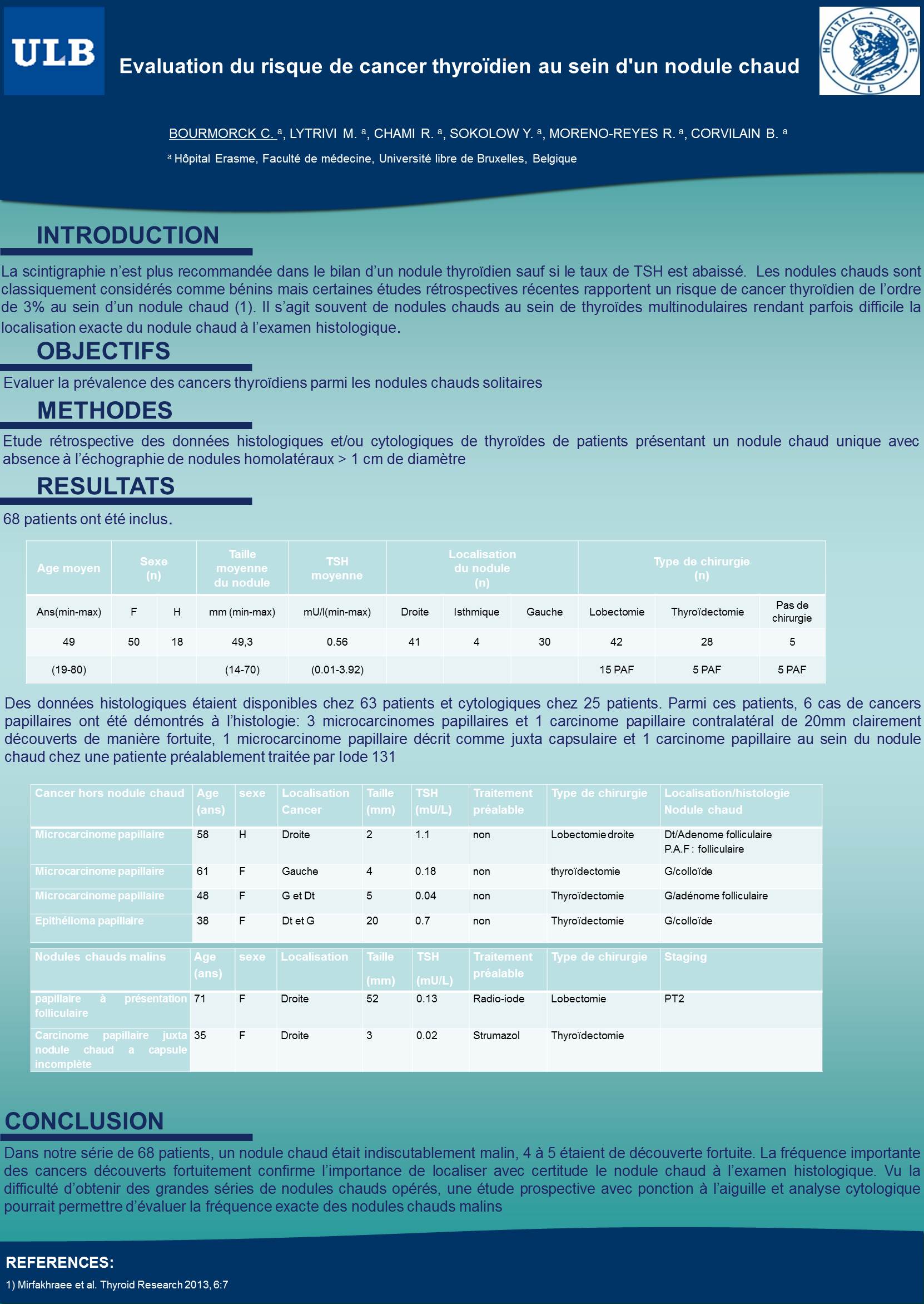 Résultats : 68 patients ont été inclus. Des données histologiques étaient disponibles chez 63 patients et cytologiques chez 25 patients. Parmi ces patients, 6 cas de cancers papillaires ont été démontrés à l’histologie: 3 microcarcinomes papillaires et 1 carcinome papillaire contralatéral de 20mm clairement découverts de manière fortuite, 1 microcarcinome papillaire décrit comme juxta capsulaire et 1 carcinome papillaire au sein du nodule chez une patiente préalablement traitée par Iode 131