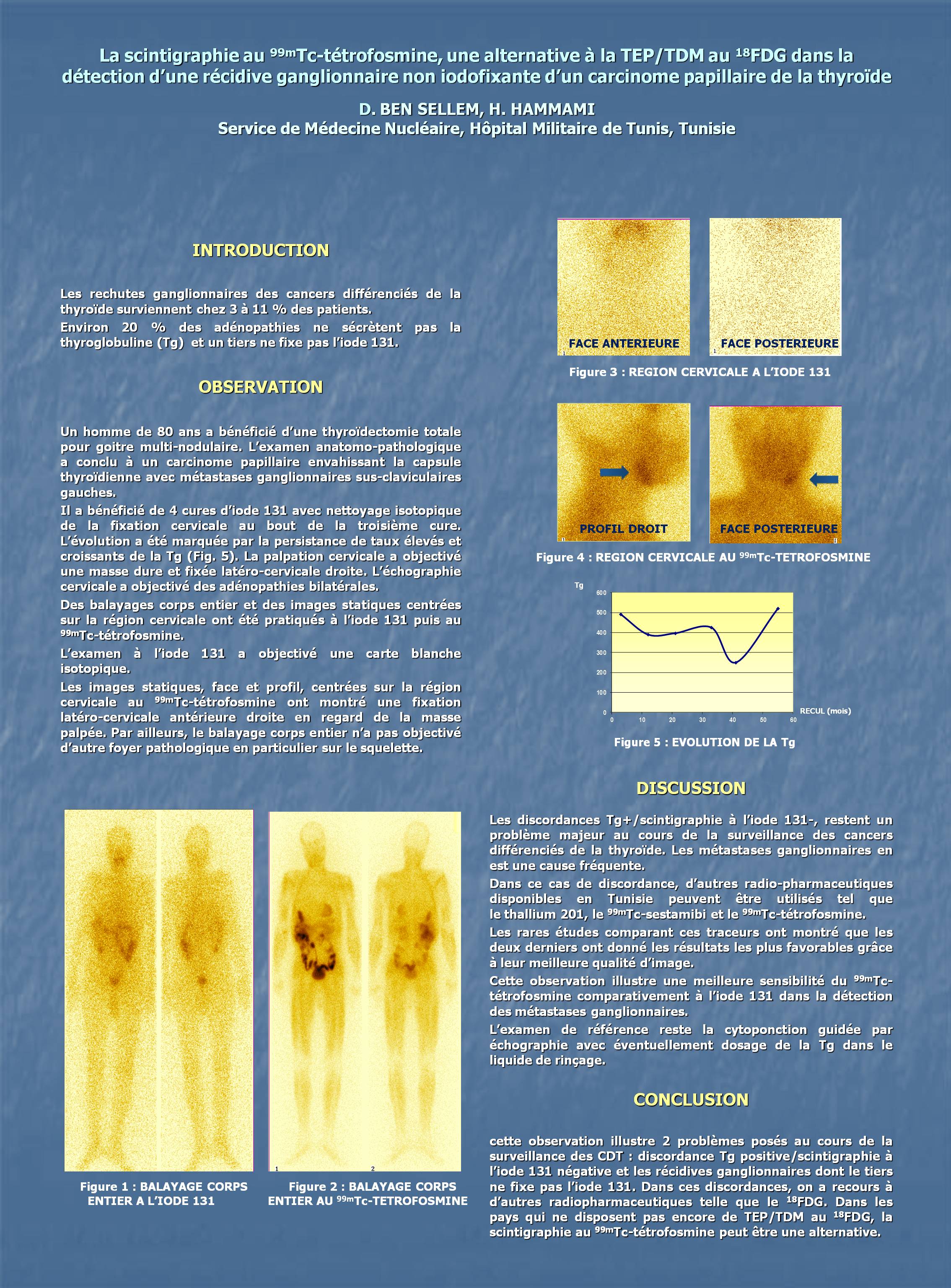 Discussion : cette observation illustre 2 problèmes posés au cours de la surveillance des CDT : discordance Tg positive/scintigraphie à l’131I négative et les récidives ganglionnaires dont le tiers ne fixe pas l’131I. Dans ces discordances, on a recours à d’autres radiopharmaceutiques telle que la 18FDG. Dans les pays qui ne disposent pas encore de TEP/TDM au 18FDG, la scintigraphie au 99mTc-tétrofosmine peut être une alternative.