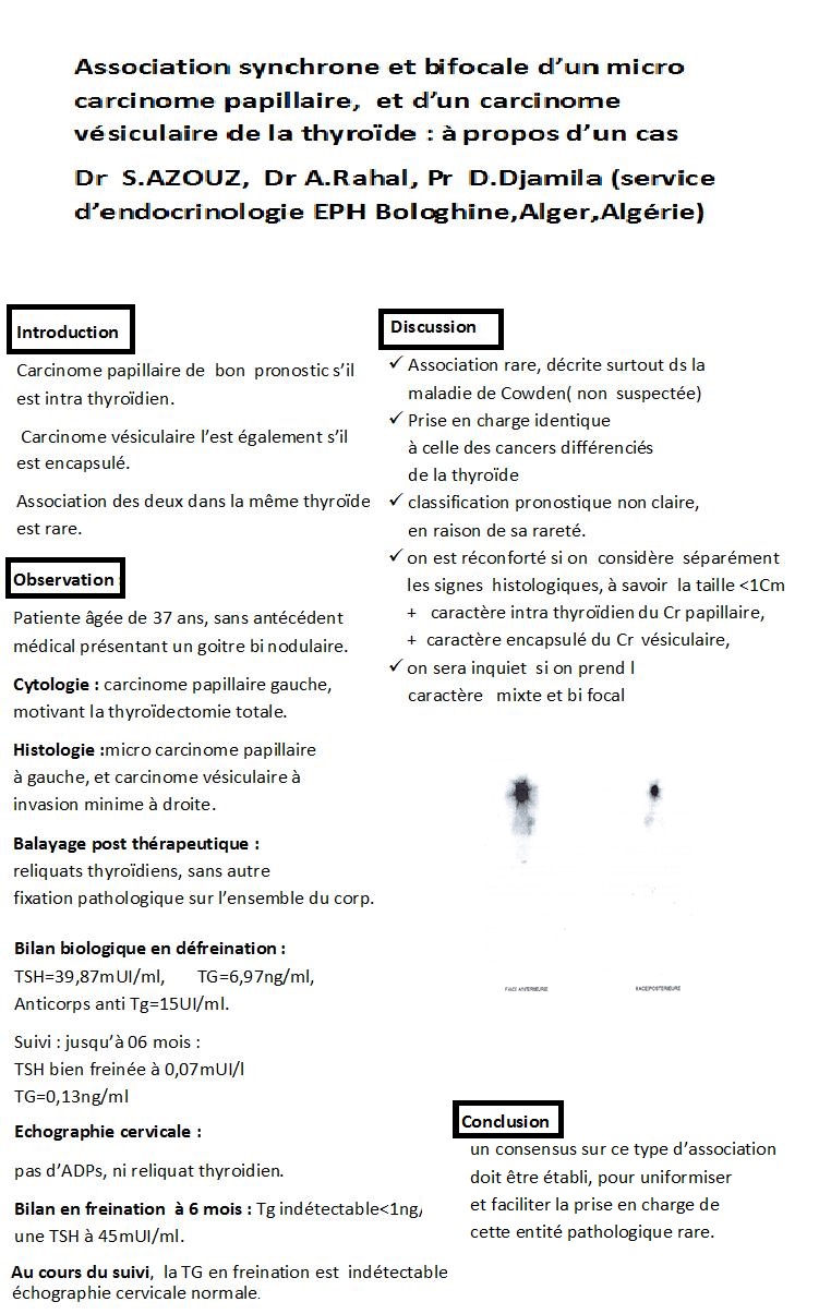 L’association synchrone de micro carcinome papillaire et de carcinome vésiculaire est rare, décrite surtout dans la maladie de Cowden, qui n’est pas suspectée chez notre patiente, sa prise en charge est logiquement identique à celle des cancers différenciés de la thyroïde, mais sa classification pronostique reste non claire, en raison de sa rareté.