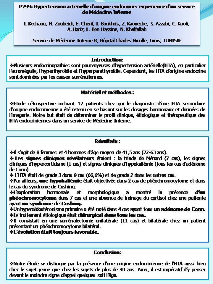 Etude rétrospective incluant 12 patients chez qui le diagnostic d’une HTA secondaire d’origine endocrinienne a été retenu en se basant sur les dosages hormonaux et données de l’imagerie. Notre but était de déterminer le profil clinique, étiologique et thérapeutique des HTA endocriniennes dans un service de Médecine Interne.
