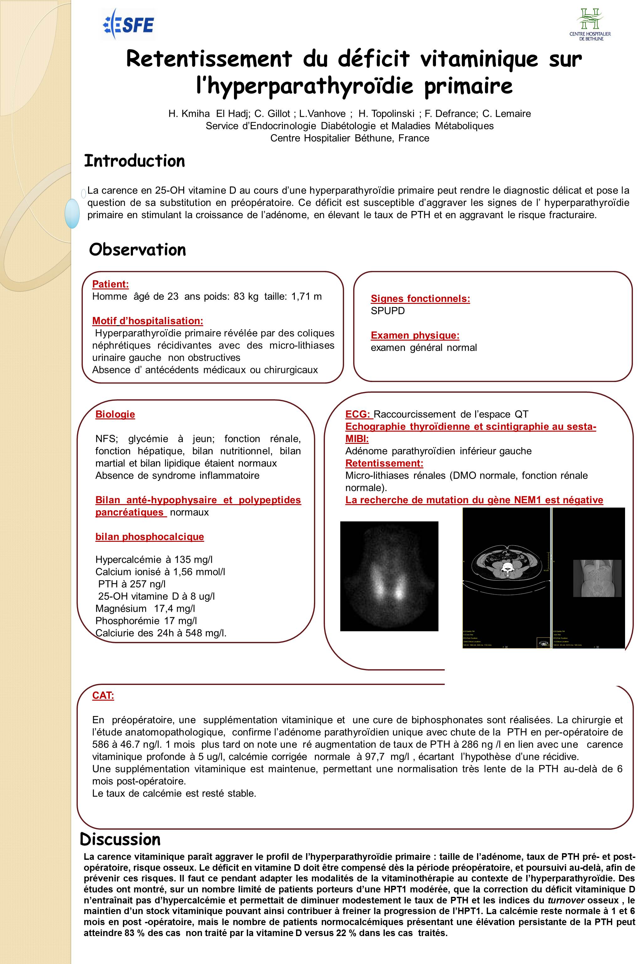 La carence en 25-OH vitamine D au cours d’une hyperparathyroïdie primaire peut rendre le diagnostic délicat et pose la question de sa substitution en préopératoire. Ce déficit est susceptible d’aggraver les signes de l’ hyperparathyroïdie primaire en stimulant la croissance de l’adénome, en élevant le taux de PTH et en aggravant le risque fracturaire.
