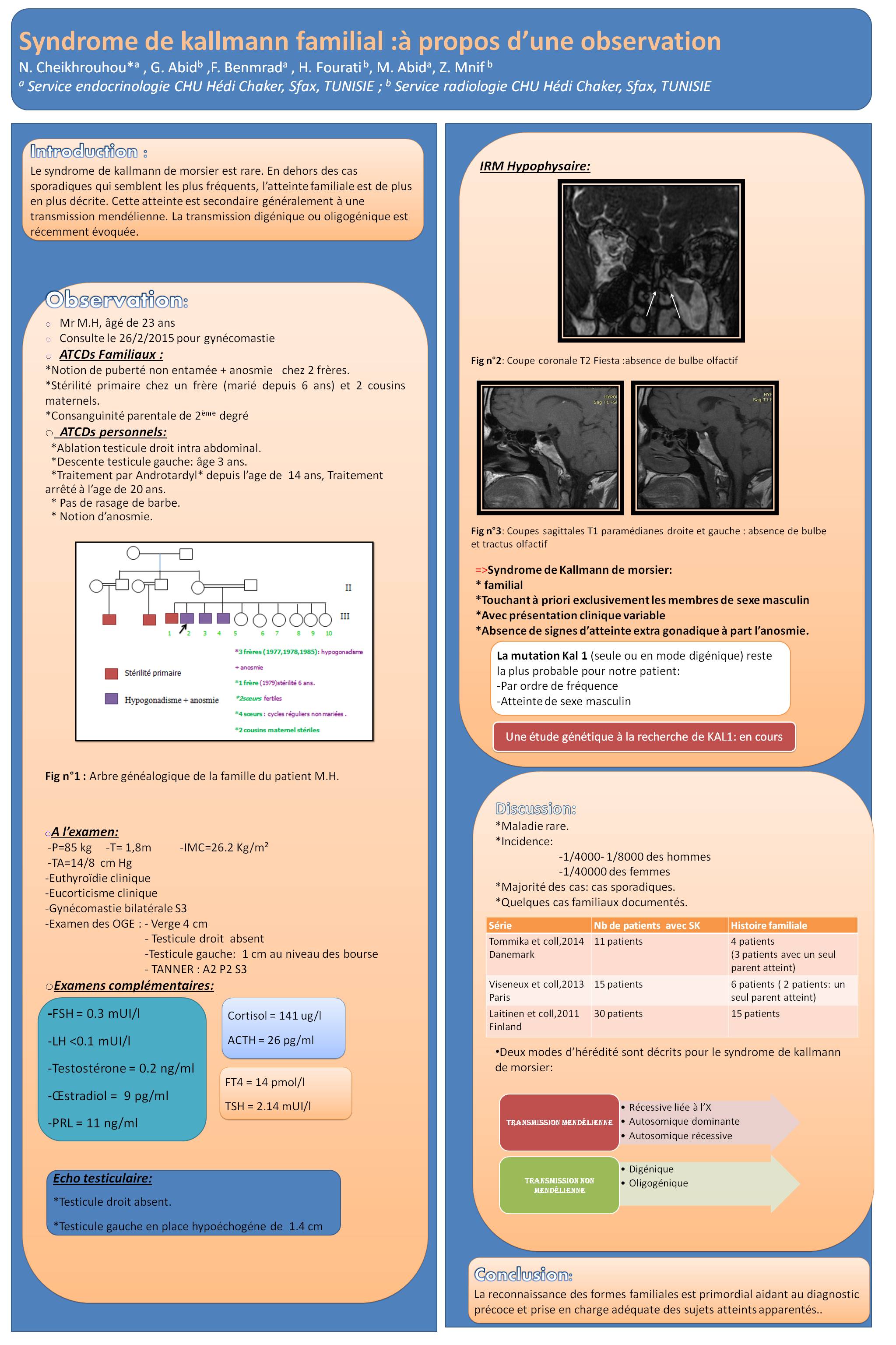 Nous rapportons le cas de Mr M.H âgé de 23 ans qui consulte pour gynécomastie associée à une anosmie. Il est issu d’un mariage consanguin de 2 ème degré avec notion de puberté non entamée et une anosmie chez deux frères,une stérilité primaire chez un frère et deux cousins maternels. L’exploration clinicobiologique a conclu à un hypogonadisme hypogonadotrope isolé qui serait congénital devant l’association d’un micropénis et une cryptorchidie unilatérale traitée chirurgicalement . L’ IRM hypophysaire a montré une agénésie des bulbes et des tractus olfactifs. On est devant un syndrome de Kallmann de morsier familial secondaire le plus probablement à une mutation de kal1. Une étude génétique fut lancée à la recherche du gène kal-1 pour confirmer définitivement le diagnostic.