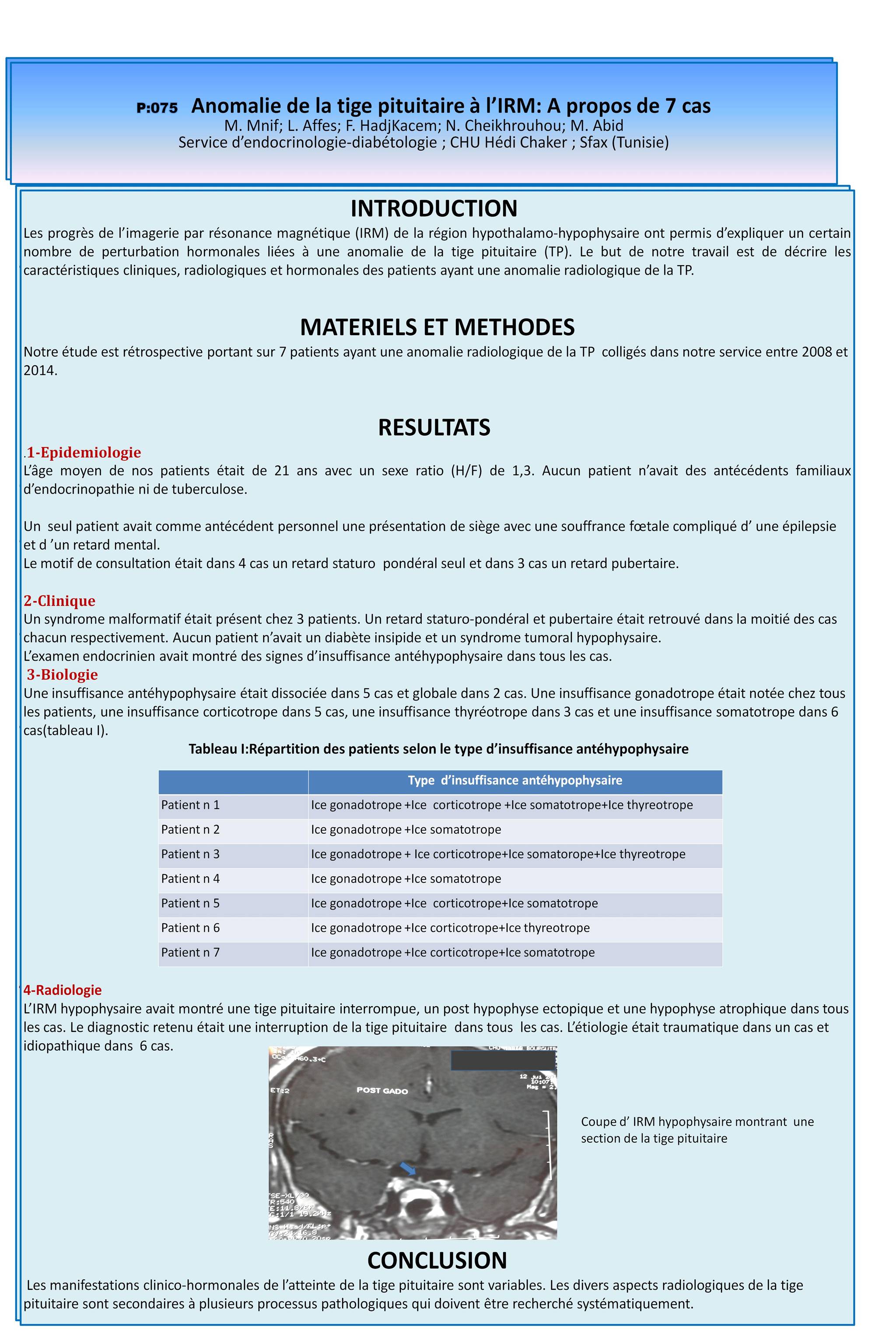 Introduction : Les progrès de l’imagerie par résonance magnétique (IRM) de la région hypothalamo-hypophysaire ont permis d’expliquer un certain nombre de perturbation hormonales liées à une anomalie de la tige pituitaire (TP). Le but de notre travail est de décrire les caractéristiques cliniques, radiologiques et hormonales des patients ayant une anomalie radiologique de la TP.