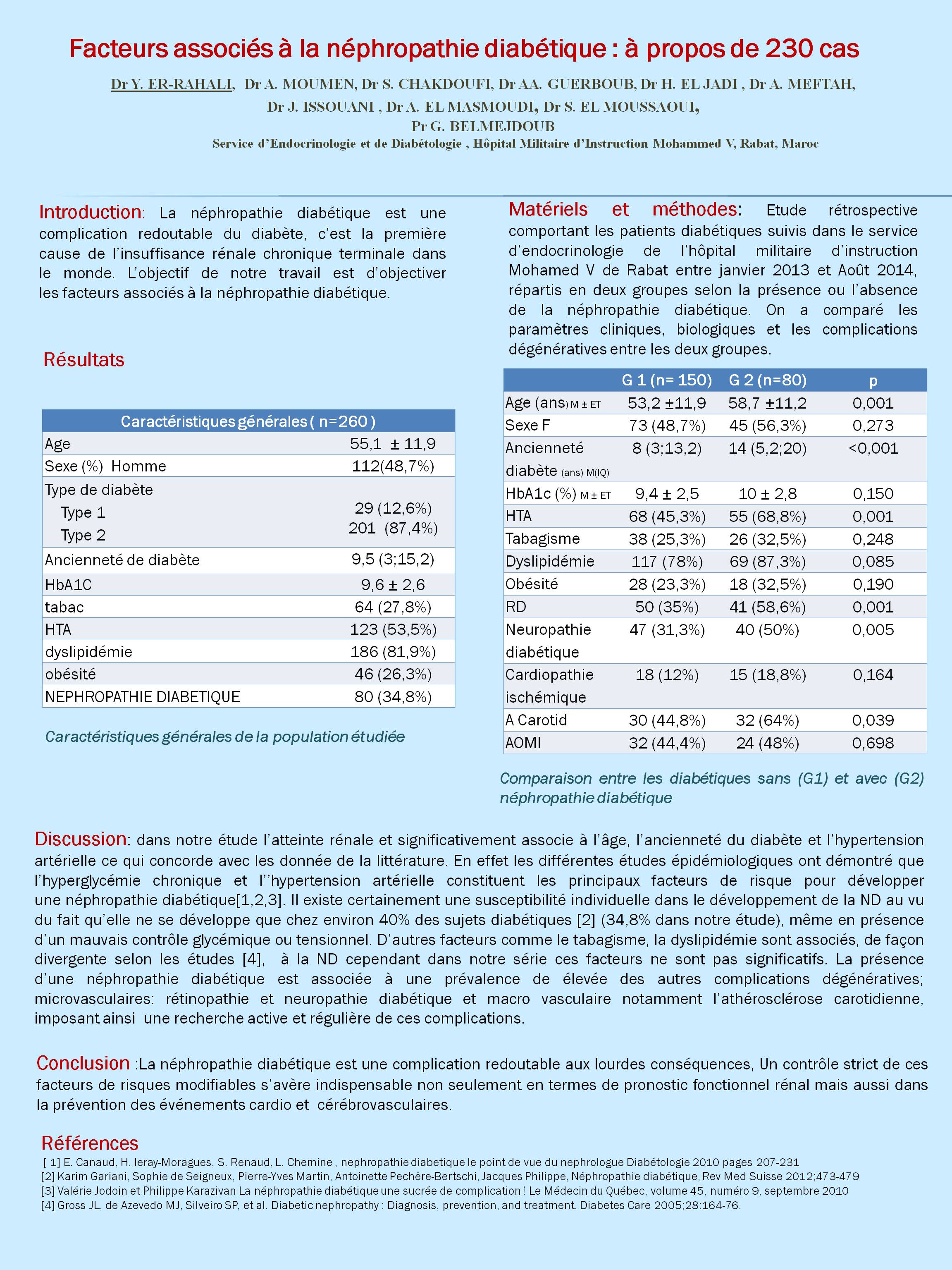 La néphropathie diabétique est une complication redoutable du diabète, c’est la première cause de l’insuffisance rénale chronique terminale dans le monde. L’objectif de notre travail est d’objectiver les facteurs associés à la néphropathie diabétique.