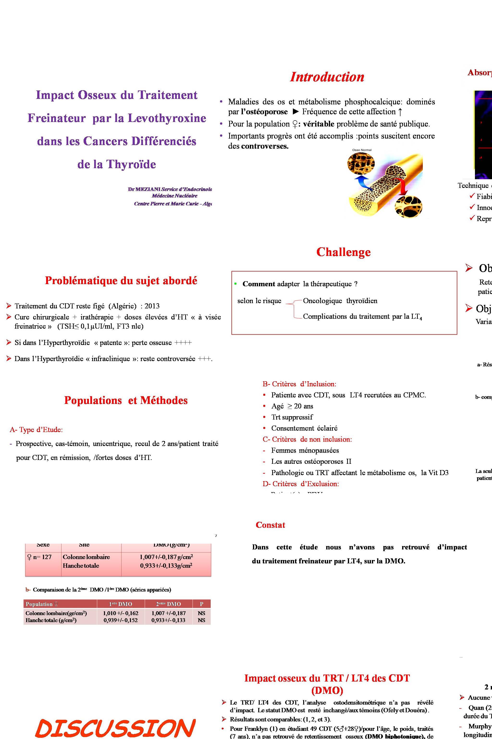 Résultats : après une année de traitement par la LT4 à visée suppressive, les résultats de la DMO n’ont pas révélé de différences significatives. Ceci peut être en rapport avec une normalisation du cycle de remodelage osseux après une courte période de changement, ou au délai insuffisant pour sa mise en évidence.