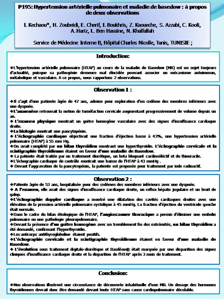 L’hypertension artérielle pulmonaire (HTAP) au cours de la maladie de Basedow (MB) est un sujet toujours d’actualité, puisque sa pathogénie demeure mal élucidée pouvant associer un mécanisme autoimmun, métabolique et vasculaire.