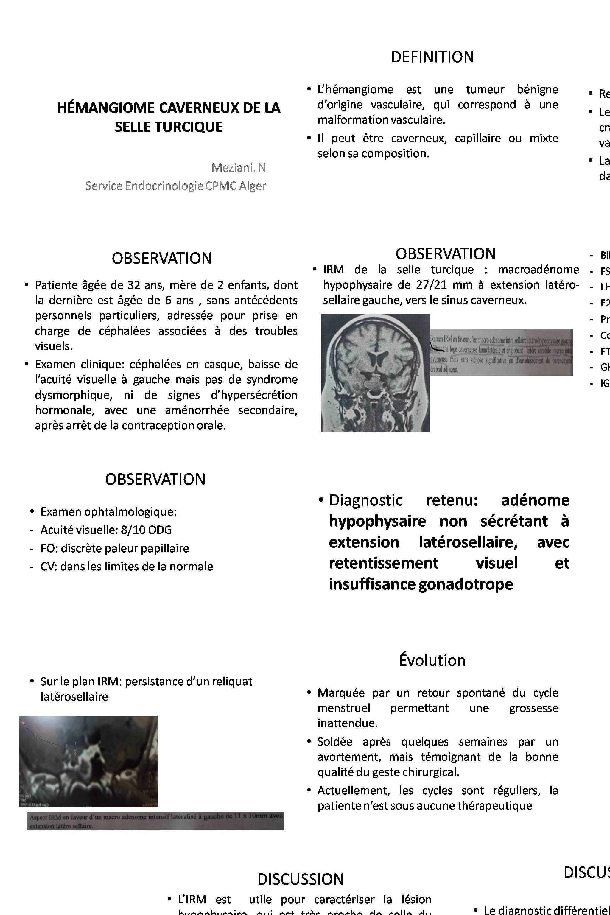 L’hémangiome est une tumeur vasculaire bénigne. Il représente 0,7 à 1% des tumeurs osseuses de localisation intracrânienne. Nous rapportons le cas d’une patiente âgée de 32 ans, mère de 2 enfants, dont la dernière est âgée de 6 ans. Elle avait consulté pour céphalées et troubles visuels, et l’exploration a révélé un processus non sécrétant de la région sellaire avec insuffisance gonadotrope. Cette lésion envahissait le sinus caverneux gauche. La chirurgie a permit un évidement satisfaisant, sans incidents post opératoires. En per-opératoire, l’aspect de la lésion n’évoquait pas un adénome hypophysaire. L’histologie révèle contre toute attente un « hémangiome ». Il n’y avait pas d’autres localisations lors du bilan d’évaluation post opératoire. L’évolution est marquée par une amélioration clinique, avec retour du cycle menstruel et permettant la survenue d’une grossesse spontanée. Les aspects cliniques, radiologiques et thérapeutiques seront discutés lors de la présentation de ce cas rare.
