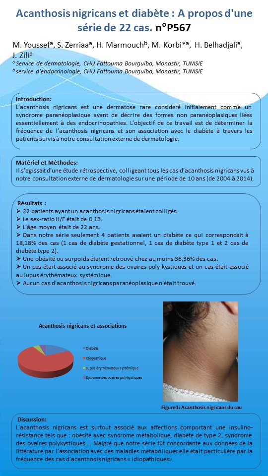L’acanthosis nigricans est une dermatose rare considéré initialement comme un syndrome paranéoplasique avant de décrire des formes non paranéoplasiques liées essentiellement à des endocrinopathies. L’objectif de ce travail est de déterminer la fréquence de l’acanthosis nigricans et son association avec le diabète à travers les patients suivis à notre consultation externe de dermatologie.