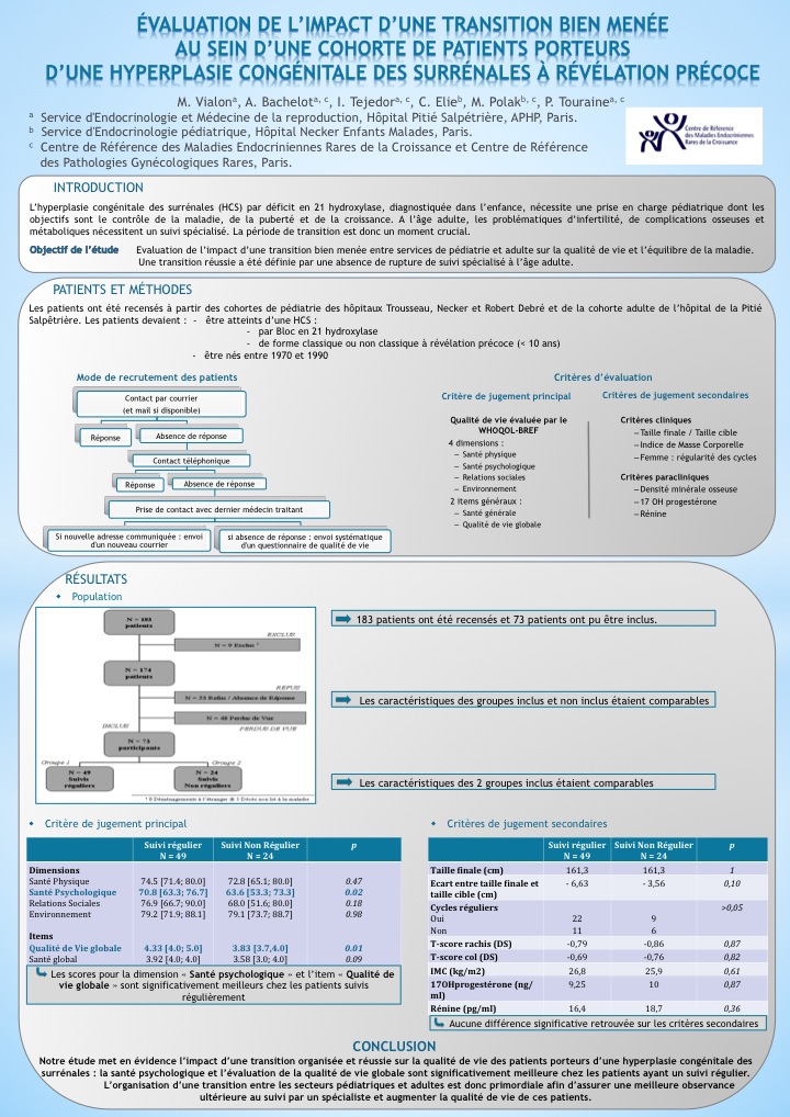 Discussion La majorité (82%) des patients ayant eu une transition organisée reste suivie sur le long terme. La qualité de vie est significativement meilleure en cas de transition réussie et de suivi régulier.