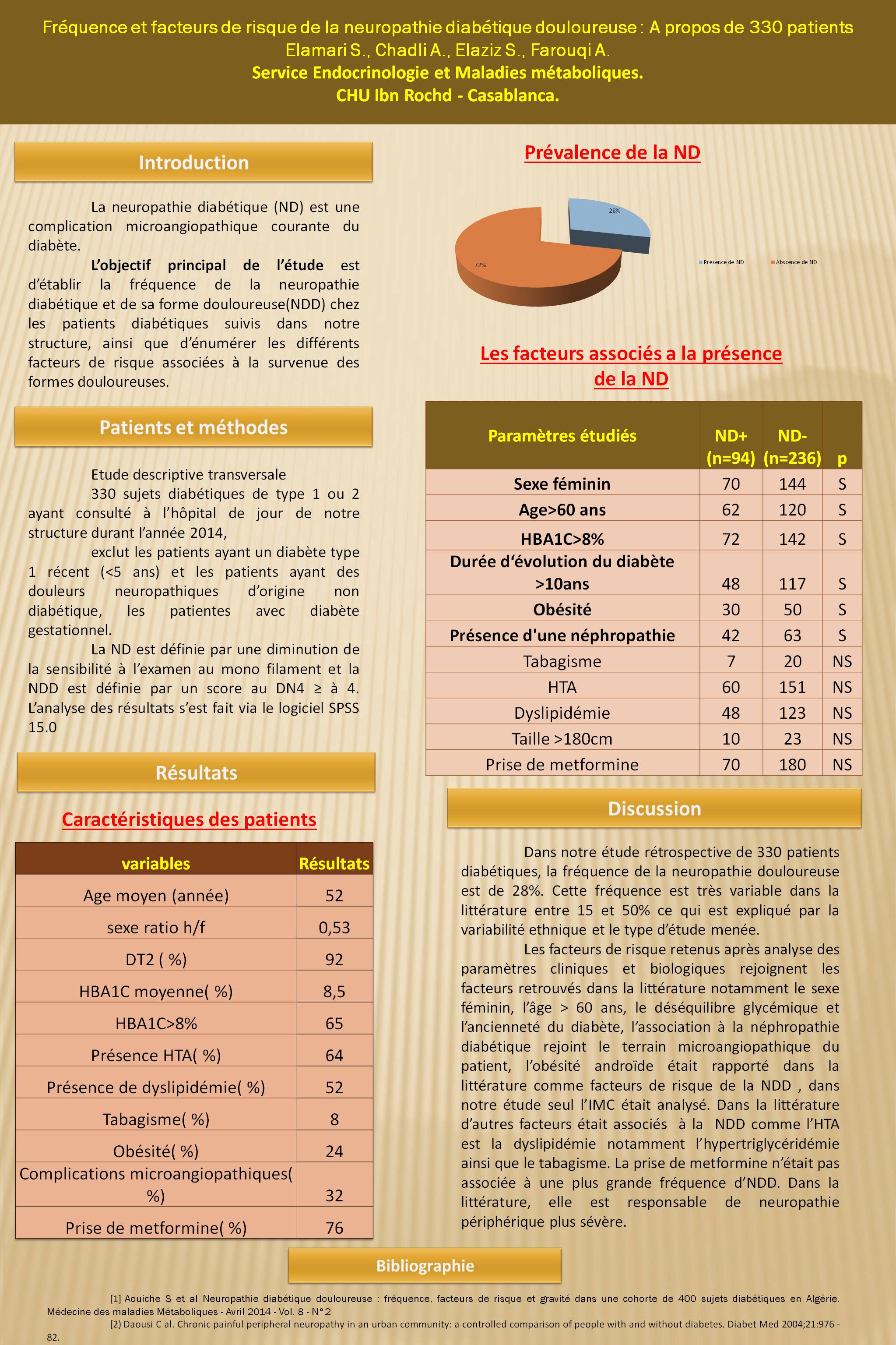 Résultats : La NDD était diagnostiqué chez 94 soit une fréquence de 28 %. La fréquence de la neuropathie diabétique était de 42 % . Seulement 55% des patients ont déjà bénéficié d’un traitement pour la NDD. Les facteurs significativement (p ≤ 0,05) associés à la présence d’une neuropathie douloureuse était le sexe féminin, un âge supérieur à 60 ans, le déséquilibre glycémique (HBA1C>8%), une durée du diabète supérieure à 10 ans, l’obésité (IMC>30kg/m²) ainsi que la présence d’une néphropathie . La prise de metformine n’était pas associée à la présence de NDD.