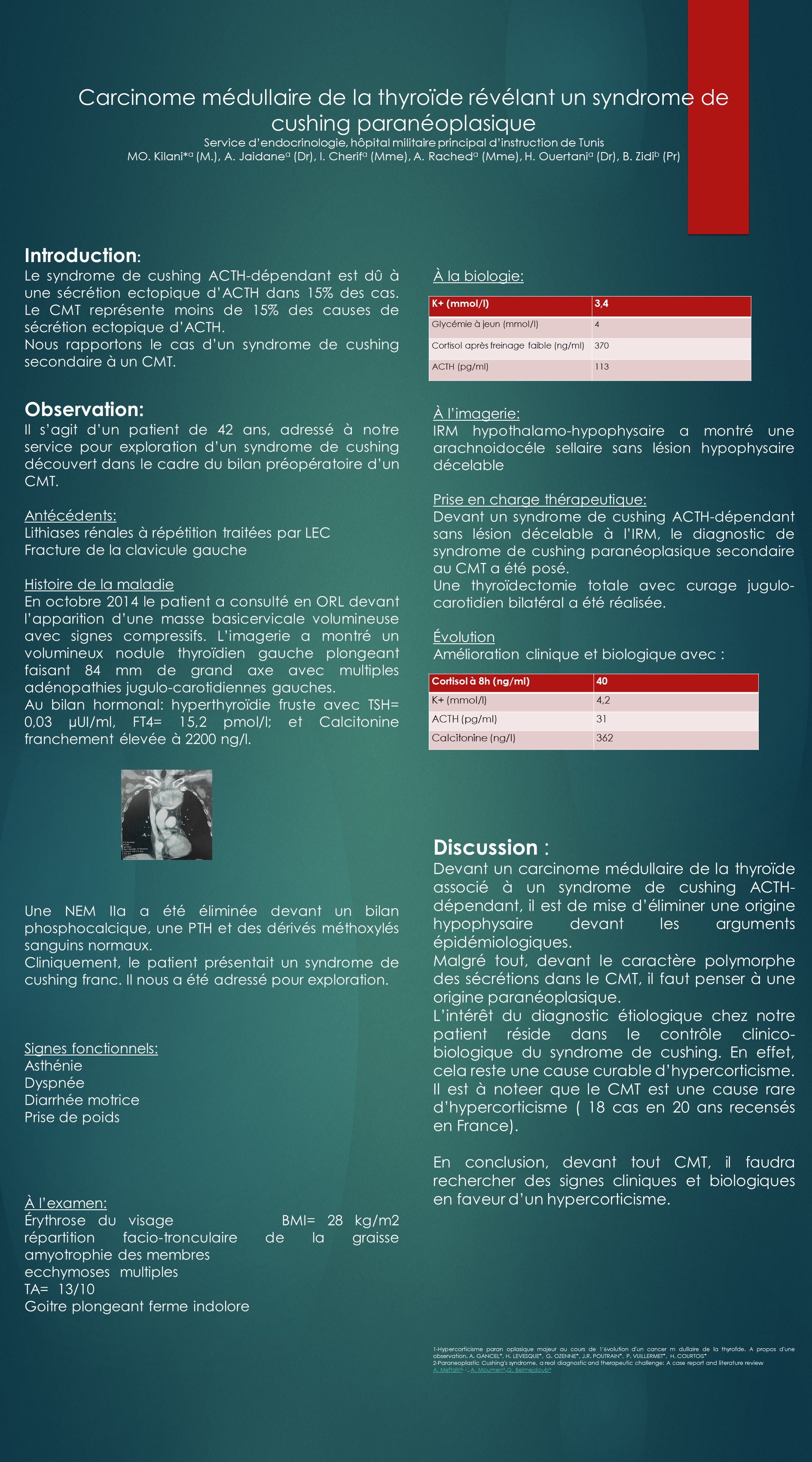 Discussion : le CMT a une présentation polymorphe, notamment sur le plan des sécrétions hormonales. il induit dans de rares cas un hypercorticisme sévère. la recherche étiologique dans ce cadre est importante étant donné que c’est une cause curable de syndrome de cushing. la guérison est obtenue après chirurgie du CMT. le traitement chirurgical consiste en une thyroïdectomie totale associée à un curage récurrentiel bilatéral et jugulocarotidien homo- ou bilatéral.