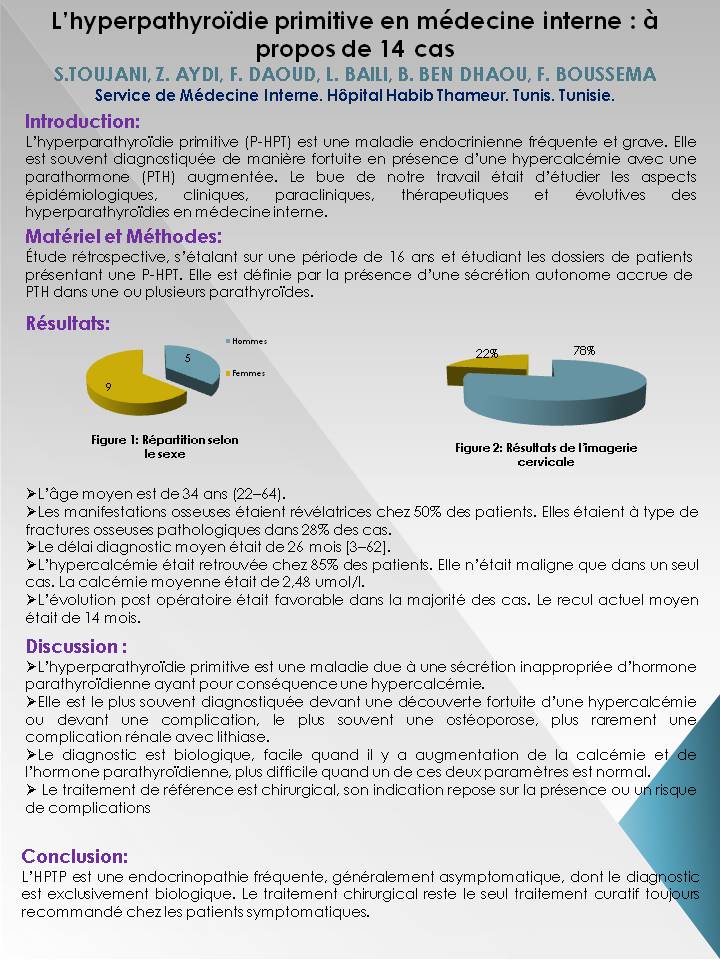 L’HPTP est une endocrinopathie fréquente, généralement asymptomatique, dont le diagnostic est exclusivement biologique. Le traitement chirurgical reste le seul traitement curatif toujours recommandé chez les patients symptomatiques.